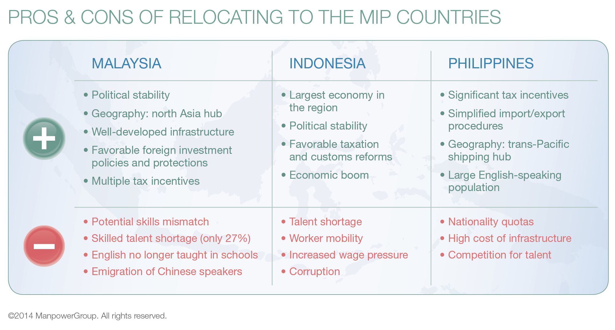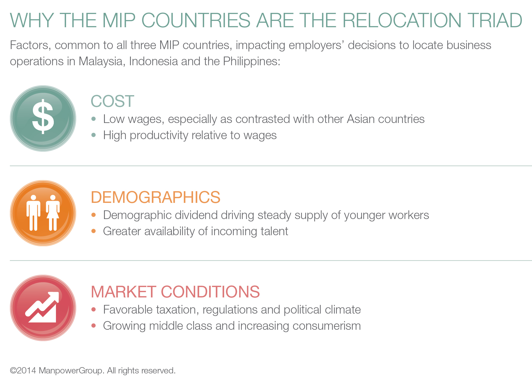 Malaysia, Indonesia and the Philippines (the MIP countries), with their large populations have become an attractive destination for global businesses. In fact, in the next decade, the MIP countries are expected to experience a demographic dividend which will translate into a steady supply of younger workers. China, on the other hand, which used to be the offshoring haven, will experience a demographic deficit as its population ages. As a consequence of these demographic trends, talent will be more easily available in the MIP countries than in China.