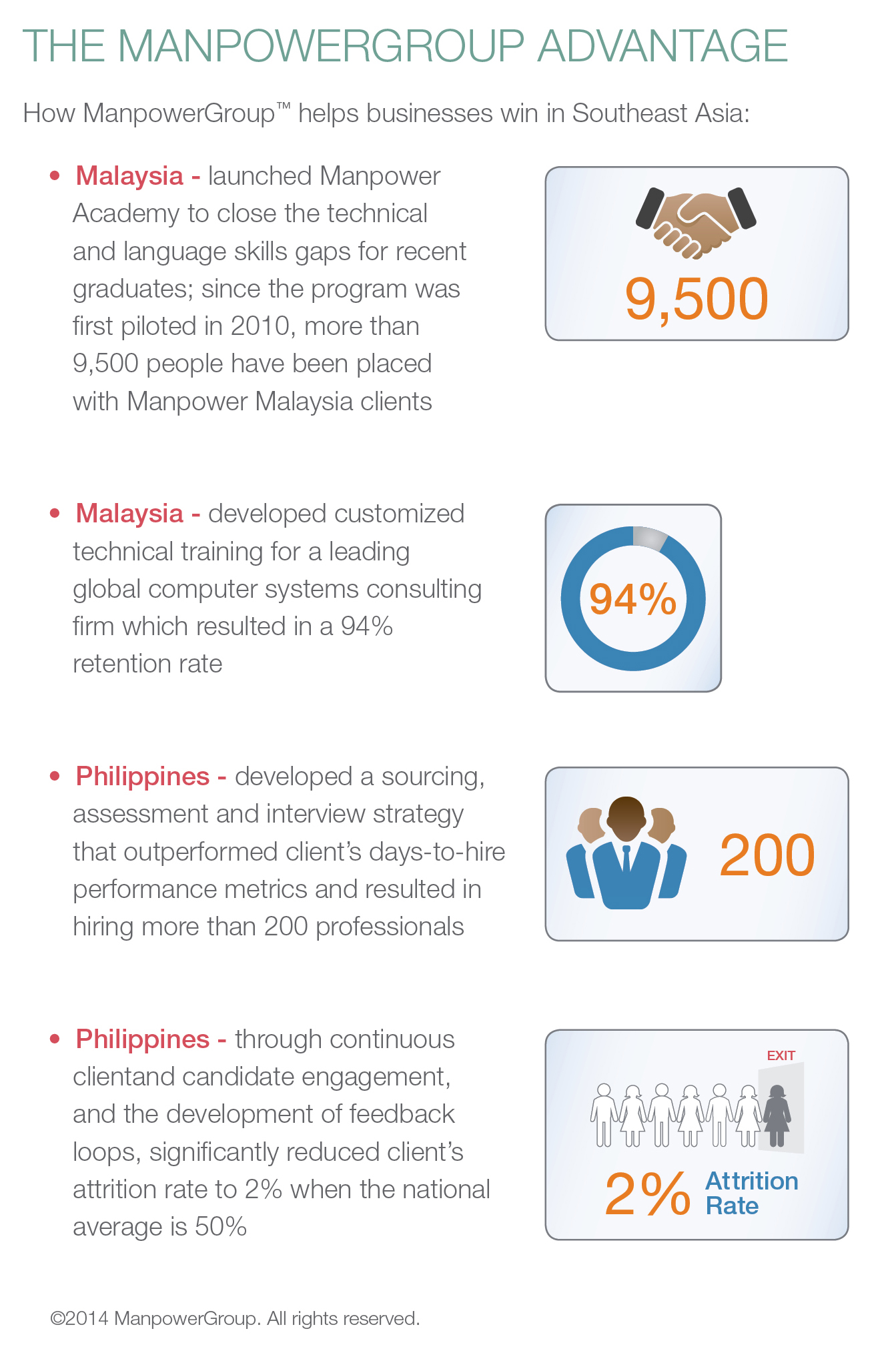 Having the right talent is essential to business success. Years of experience developing the right talent communities, and a thorough understanding of local market conditions assure ManpowerGroup’s unmatched expertise in the MIP countries, and make it uniquely qualified to support businesses expanding to Southeast Asia.