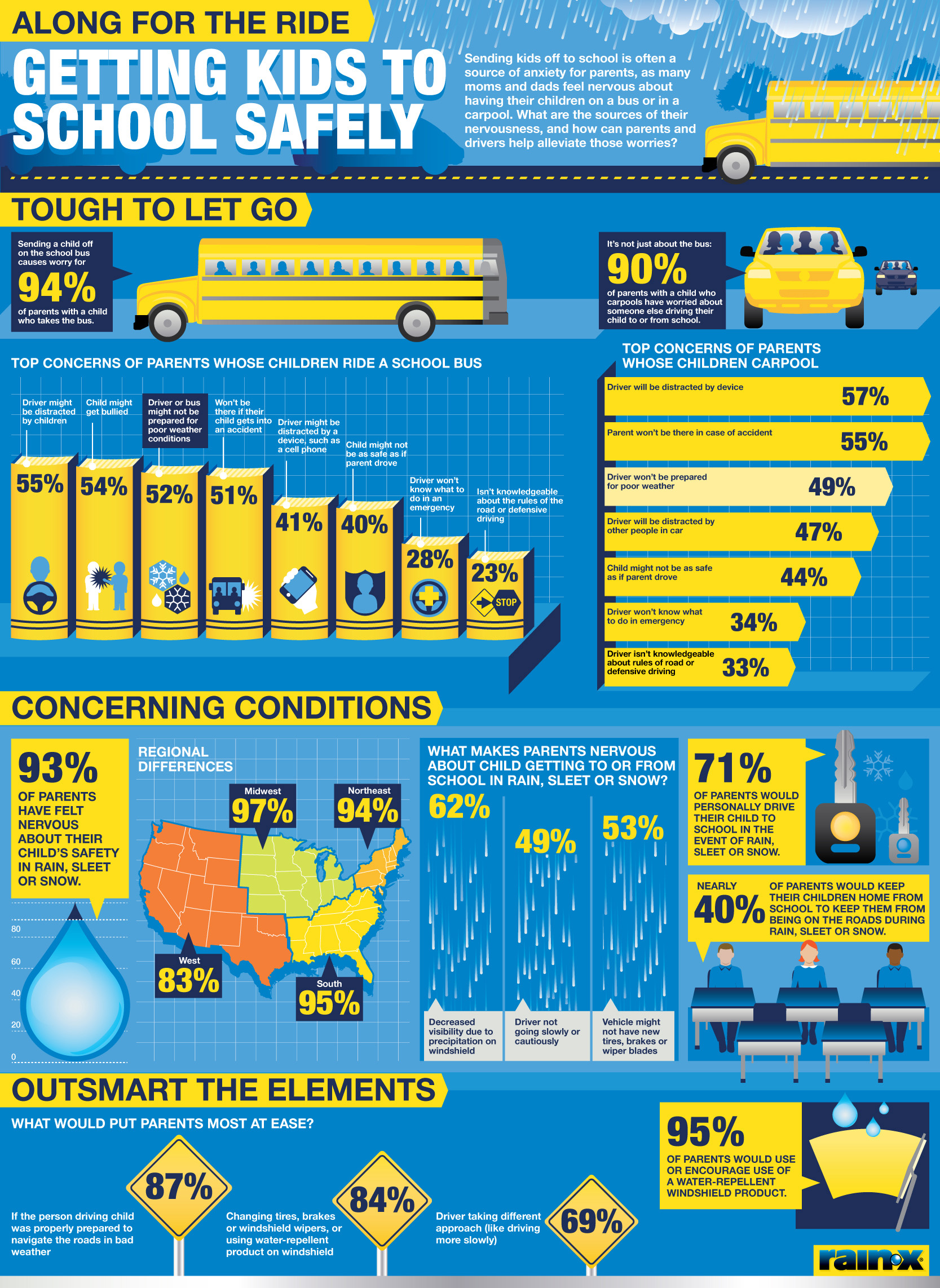 For 62 percent of parents, this concern stems from nervousness over decreased visibility that the driver could experience during bad weather. Parents whose children ride the bus (52 percent), carpool with another driver (49 percent) and parents of teen drivers(32 percent) all worry that drivers and their vehicles may not be prepared for such conditions. However, more than 8 in 10 parents said their concerns would be alleviated knowing a vehicle was properly maintained with features like a water-repellent product for windshields, windows and mirrors for optimal visibility in even the worst weather conditions.