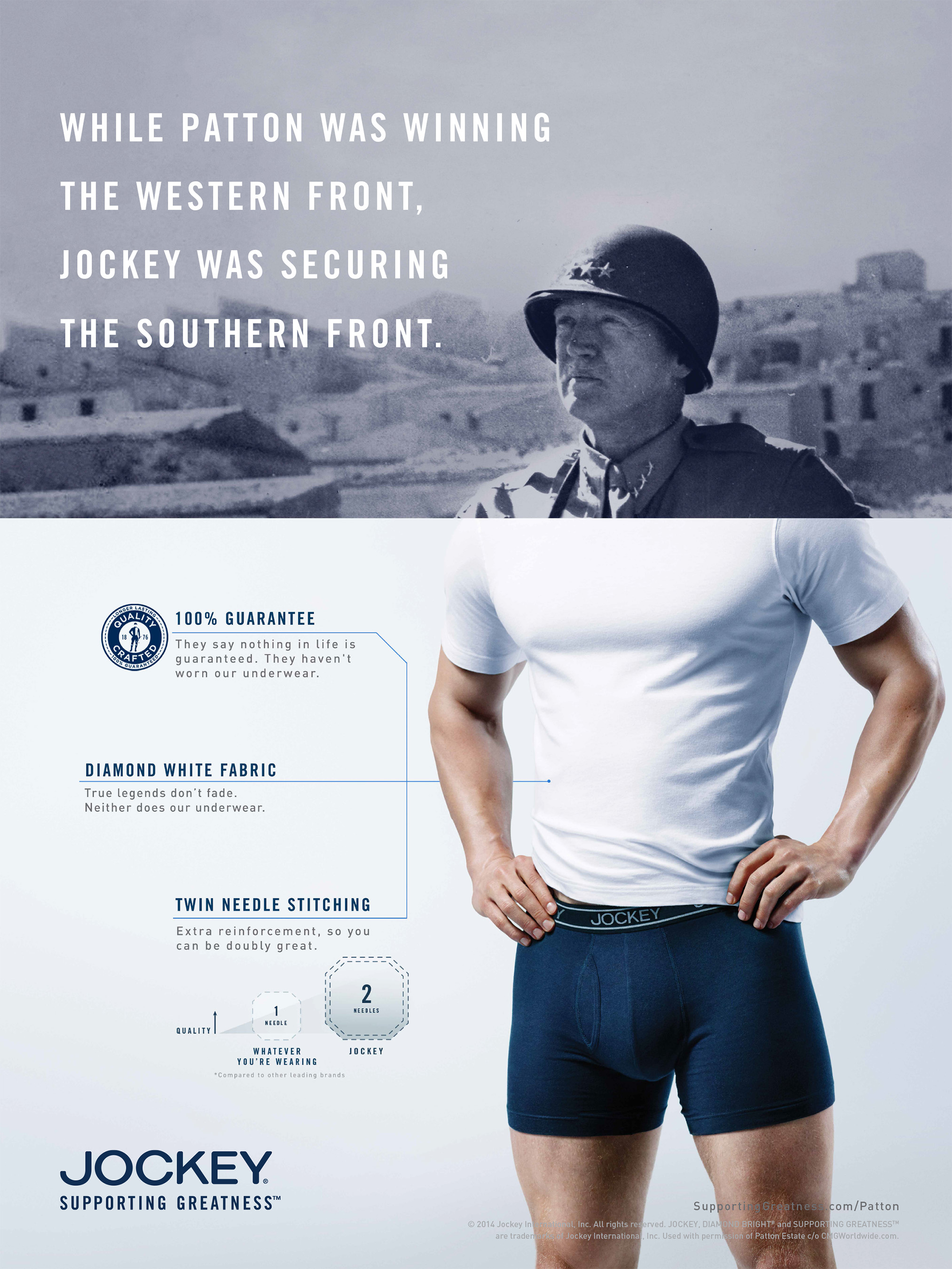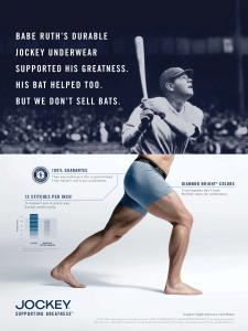 The broadcast, print and digital elements ask audiences to imagine what further greatness these men could have achieved with modern–day Jockey underwear as the campaign depicts Babe Ruth hitting a home run, Buzz Aldrin walking on the moon and General Patton leading his men to victory, and marry the historical feats with a modern–day depiction of how underneath their respective pinstripes, spacesuit, and camouflage uniforms, Jockey underwear was supporting them along the way.
