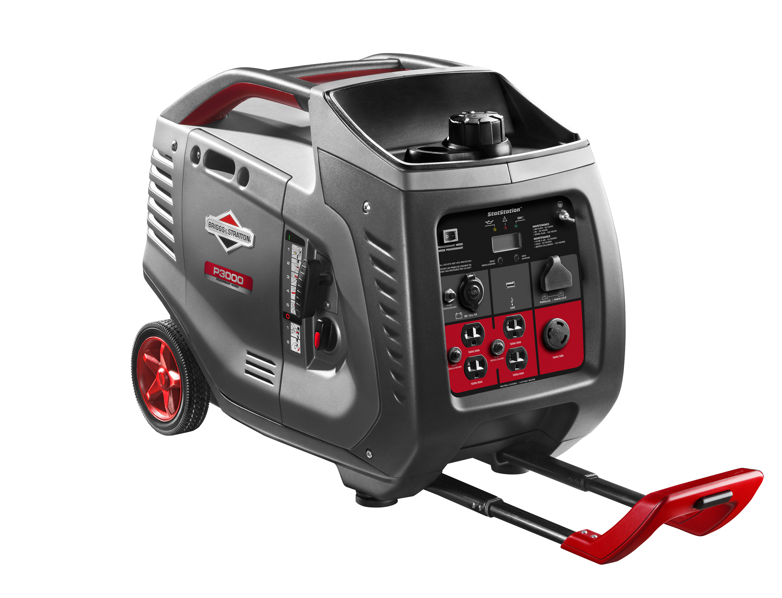 The P3000 is also the first in its class to offer the combination of a USB charging port, perfect for charging cell phones, which frees up an outlet to power additional items. The StatStation LCD display provides information on how many watts are currently being used and provides maintenance reminders. The unit’s luggage-style, lift-assist transportation system allows for easy maneuverability by one person with its telescoping handle and a twin-handle for two-person lifting.