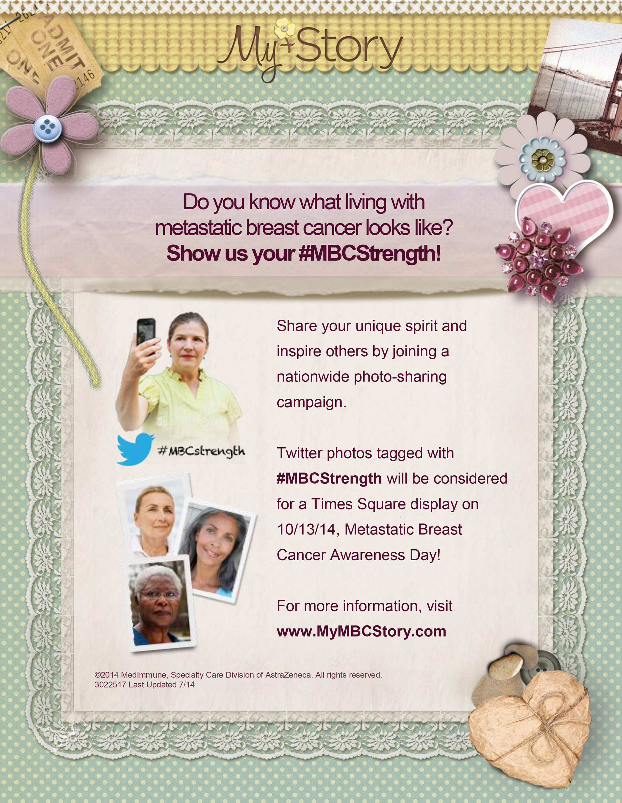 To show their support, women living with metastatic breast cancer can upload photos of themselves on social media using the campaign hashtag #MBCStrength. Photos posted on Twitter by October 1, 2014 and tagged with #MBCStrength will be considered for a Times Square display in New York City on the fifth anniversary of Metastatic Breast Cancer Awareness Day on October 13, 2014.