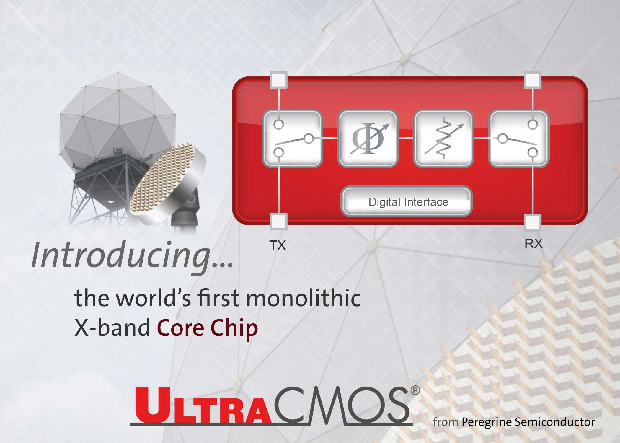 At the higher end of the frequency spectrum, Peregrine introduces the industry's first integrated X-band, CMOS core chip to utilize MMIC (monolithic microwave integrated circuit) design techniques, enabling highly accurate signal control with minimal power loss. MMIC design techniques, such as Lange couplers, have only been used by III-V technologies. The use of these passive techniques on silicon has always presented a challenge due to silicon's lossy nature at higher frequencies. Peregrine solves this challenge by using an UltraCMOS sapphire substrate–a near-perfect insulating substrate that naturally lends itself to integration. With this X-band core chip, Peregrine combines standard CMOS design with passive MMIC circuitry for a truly intelligent approach to integration at microwave frequencies.