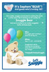 - A virtual birthday celebration ‘Twitter’ Party hosted by @Snuggle_Bear will be held September 17 (1:00 – 2:00 PM EST) using #HappyBirthdaySnuggle