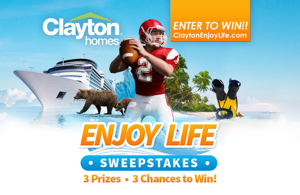 **NO PURCHASE NECESSARY TO ENTER OR WIN. A PURCHASE WILL NOT INCREASE YOUR CHANCES OF WINNING. VOID WHERE PROHIBITED. Only open to legal residents of the 50 U.S. (excluding AK, HI, NY and RI) and D.C., who are the age of majority or older in the jurisdiction in which they reside. Promotion Period starts September 2, 2014 at 12:00:00 p.m. EDT and ends November 30, 2014 at 12:00:00 p.m. EST. Prize drawings are as follows at a time to be determined in Sponsor’s sole discretion: Big Game (Drawing 10/1); Alaskan Cruise (drawing 11/3); Caribbean Vacation (drawing 12/1). Eligible entries must be received by noon EST the day of the drawing in order to be eligible for the drawing. Limit: One entry per person/per email address. For full Official Rules and complete details, visit http://www.ClaytonEnjoyLife.com. Sponsor: CMH Homes, Inc. and CMH of KY, Inc., 5000 Clayton Road, Maryville, TN 37804.
