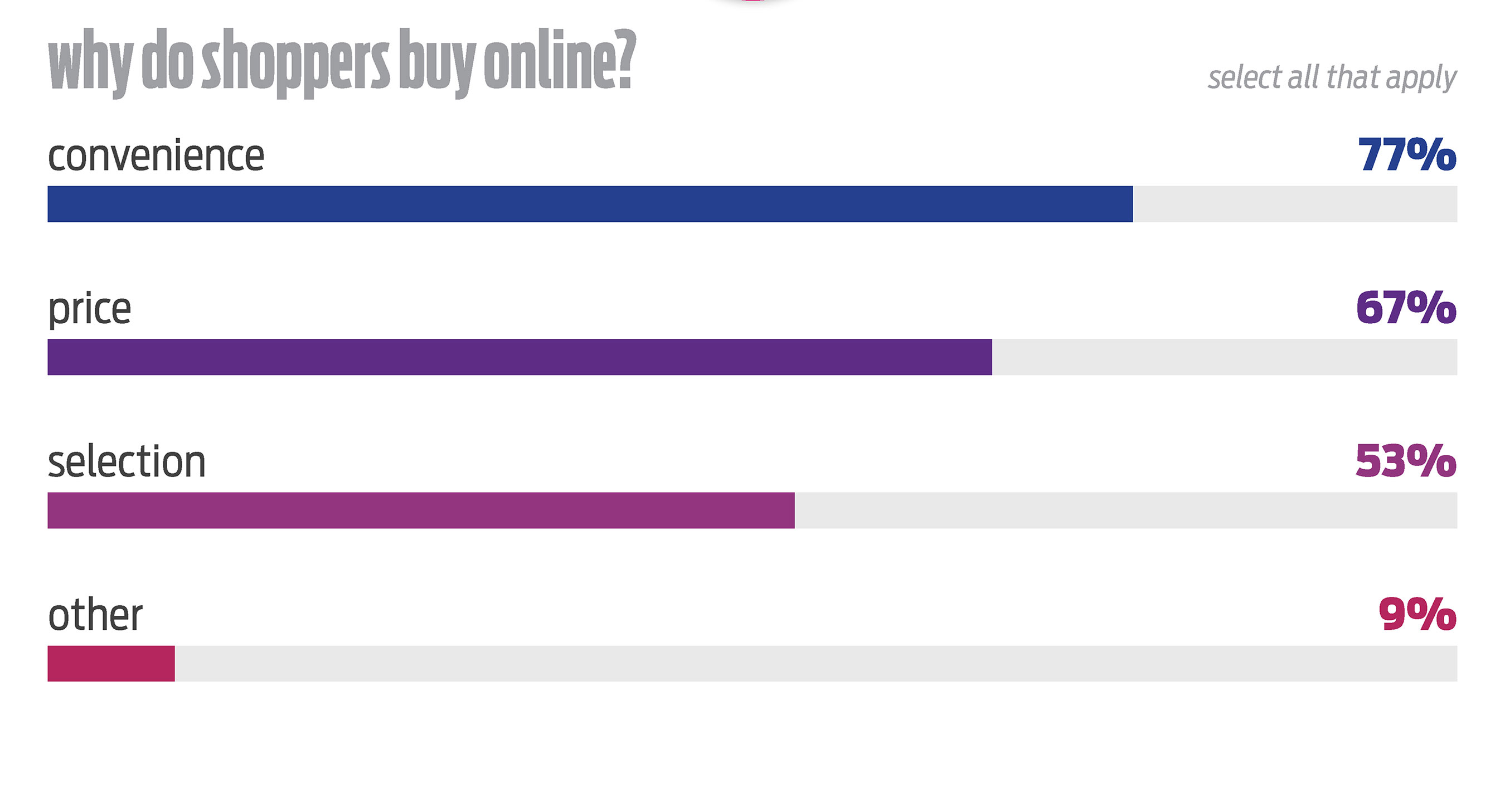 - Convenience and price are driving customers online: Last year online was driven by price, but as offline stores have improved their price strategies and online continues to improve their experience — particularly for mobile — convenience has become a significant deciding factor for purchasing online.