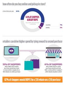 - Incentives accelerate BOPIS: 63% of shoppers BOPIS (buy online, pickup in store) at least a few times a year, but 82% percent would consider doing so to receive a $10 rebate on a $50 item. This option marries the convenience of online comparison shopping with the immediate gratification of same-day pickup.