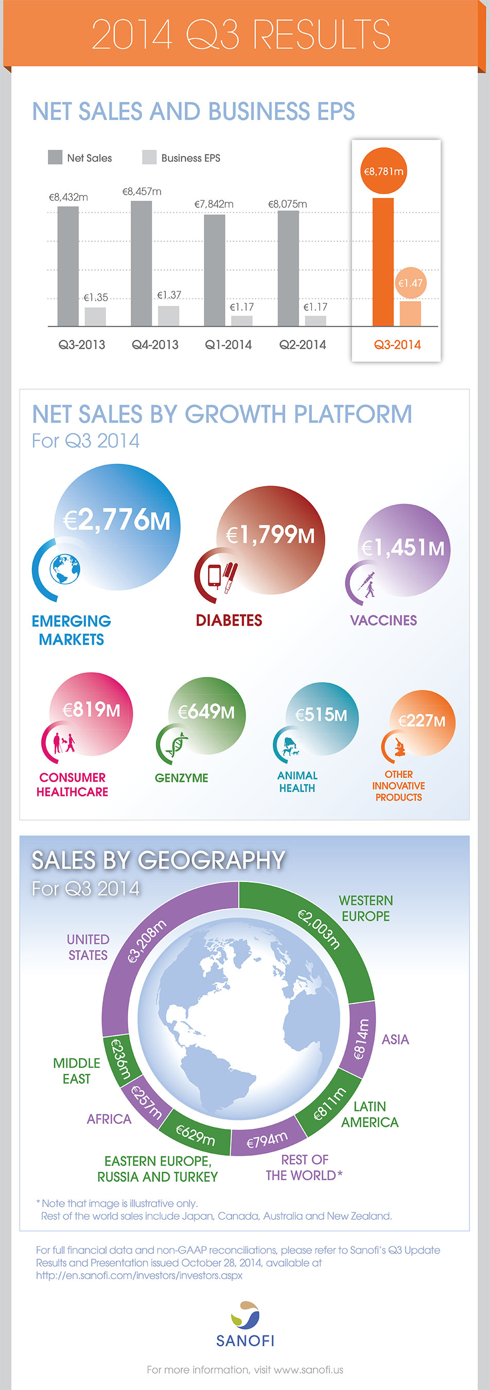 Commenting on the Group's performance in Q3 2014, Sanofi Chief Executive Officer, Christopher A. Viehbacher said, “We are pleased with our performance in the third quarter. We achieved solid Business EPS growth driven by continued strong contribution from our growth platforms, allowing us to confirm 2014 outlook. Growth platforms reached over 78% of sales and grew 10%. We have recently seen a more challenging U.S. diabetes price environment which will impact our diabetes sales throughout 2015, while growth platforms globally are expected to continue to show solid growth. At the same time, our pipeline delivered strong results, with the release of exciting Phase III data for alirocumab and our Dengue vaccine, the entry of dupilumab in Phase III as well as the FDA approval of Cerdelga™ and the licensing of Afrezza®.”