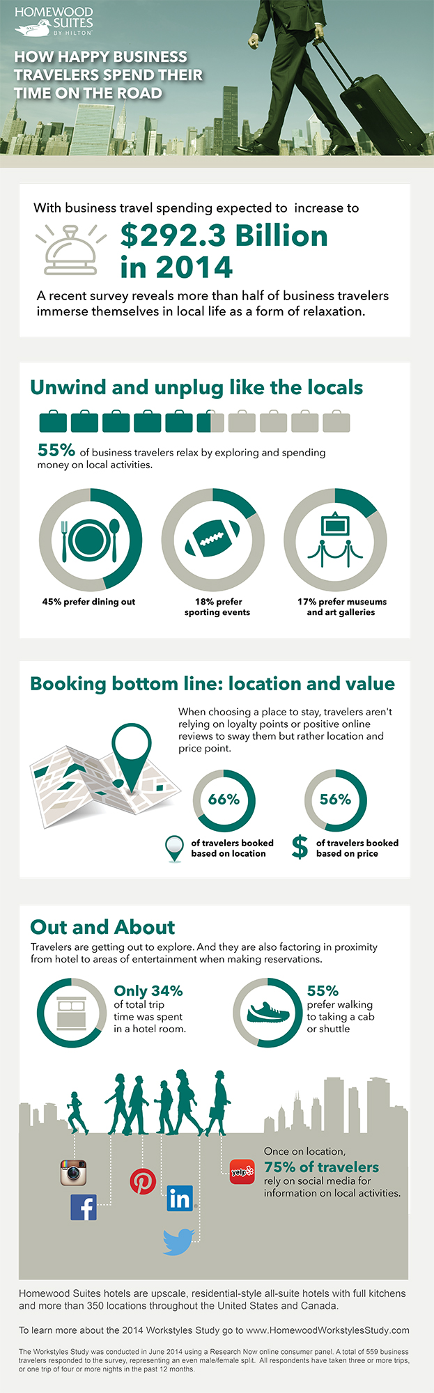 The 2014 Workstyles Study by Homewood Suites by Hilton, the third edition of the biannual survey, found 55 percent of business travelers relax by participating in and spending money on local activities, in part contributing to a projected 6.8 percent increase in business travel spending this year according to the Global Business Travel Association.