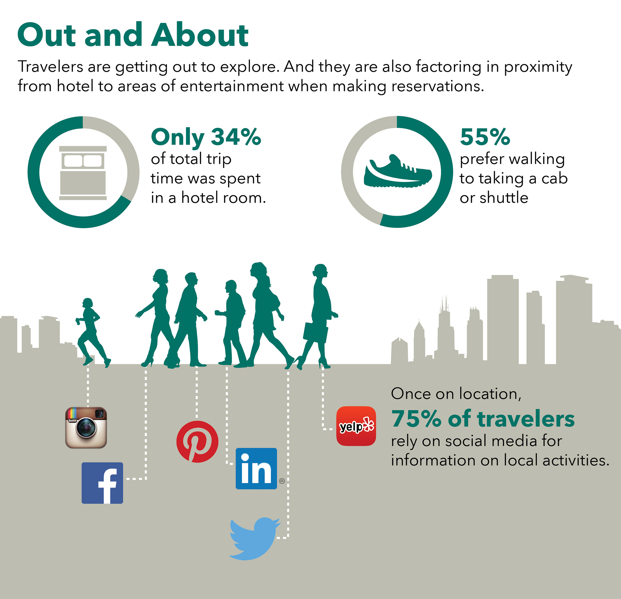 Travelers are also factoring in proximity from hotel to areas of entertainment when making reservations. Fifty five percent of respondents said they'd prefer walking to taking a cab or shuttle as a form of transportation. And when planning how to explore, 75 percent rely on social media for information on local activities, behind online research and recommendations from friends and family.