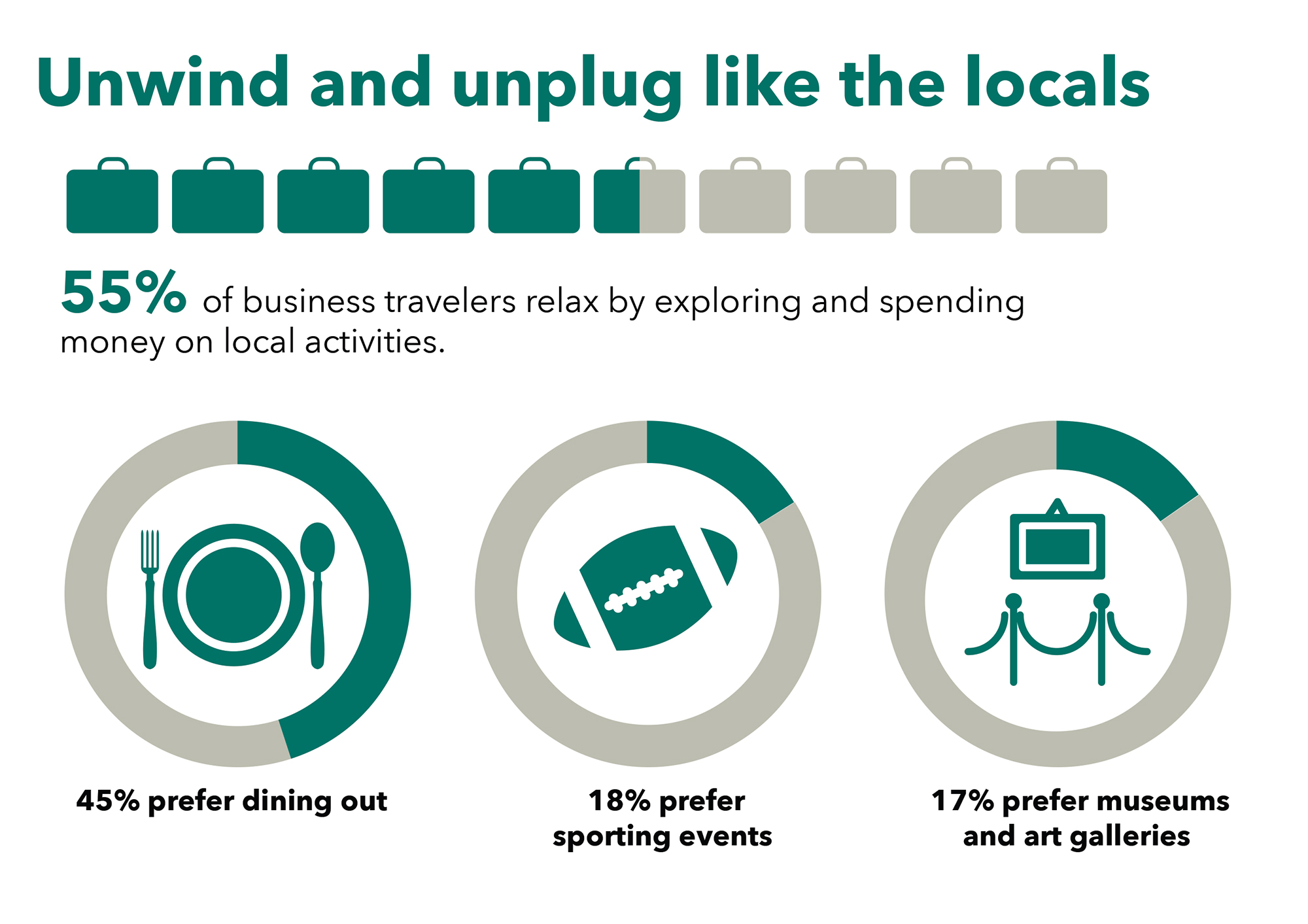 - The “bleisure trend” is alive and healthy, as sixty two percent of respondents were likely to extend business trips to enjoy local activities