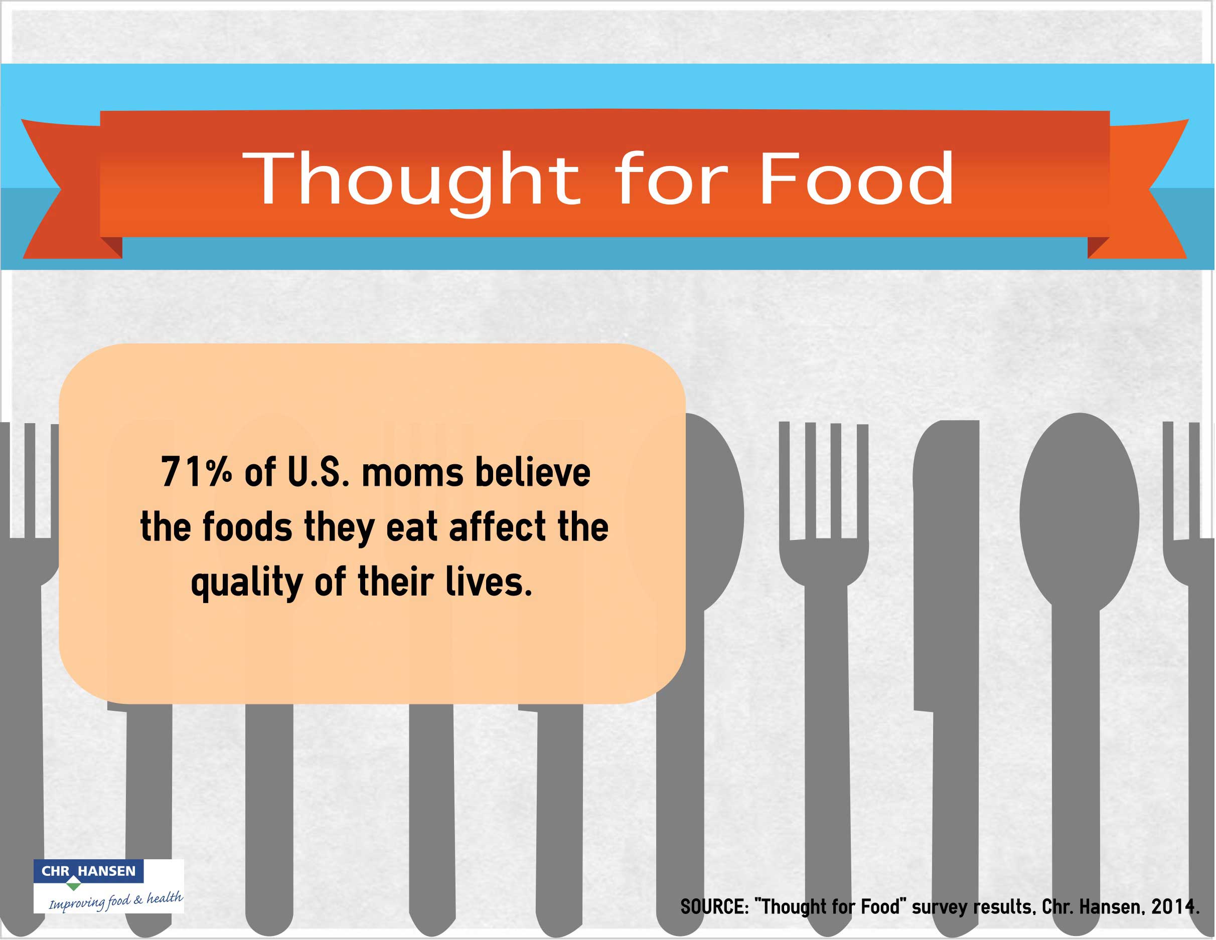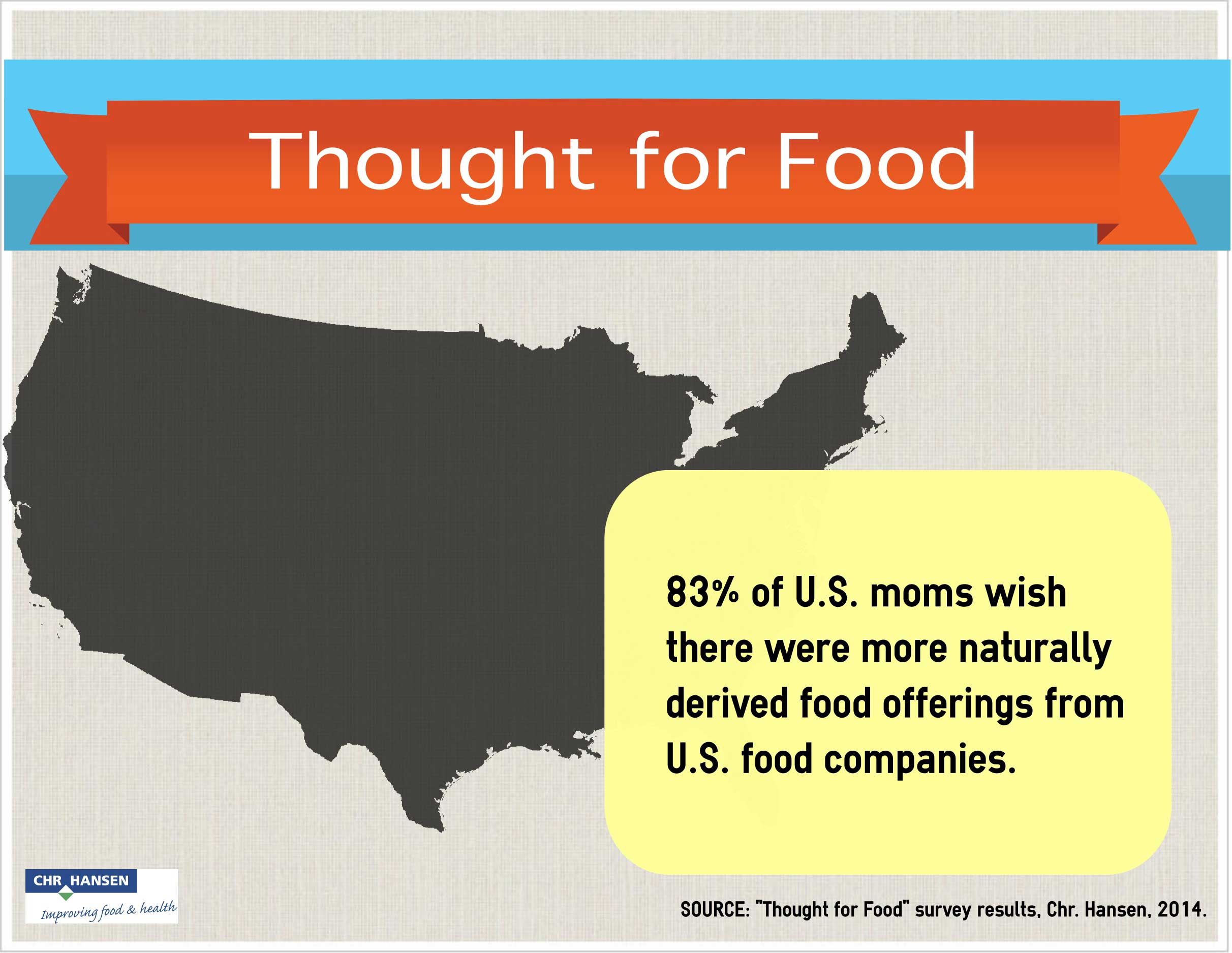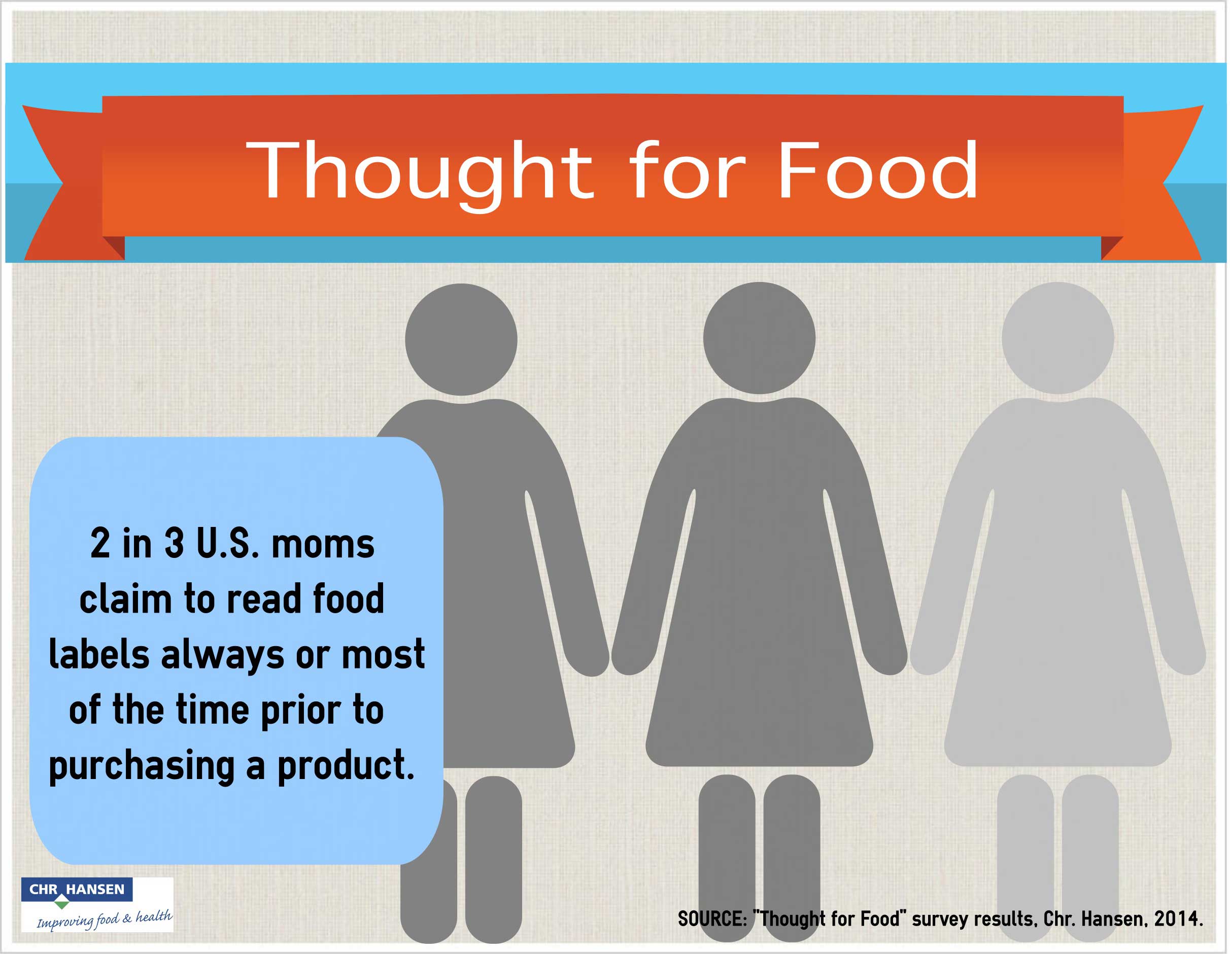 Leading food ingredient company, Chr. Hansen, Natural Colors Division, commissioned the “Thought for Food” survey to learn what U.S. moms look for in food labels and gauge their perceptions of natural ingredients. While moms rely on personal insight gained from Google searches, news segments and social media discussions, most of their purchasing choices are made by reading food labels.