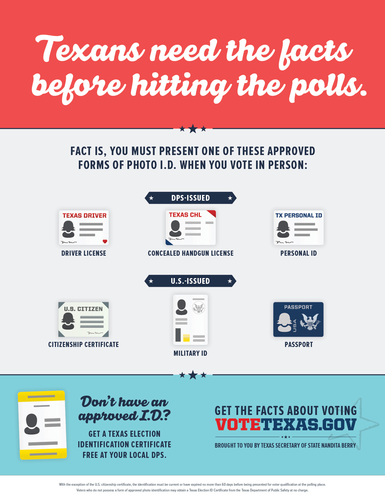 “Texans feel strongly about making their voices heard, and it’s my job to make sure they know how, when, and where to do that by exercising the right to vote,” said Secretary Berry. “That’s why I’ve been traveling across the state, reminding Texans to bring an approved photo ID to the polls, and ensuring Texans know VoteTexas.gov is the quickest way to answer questions about voting.”