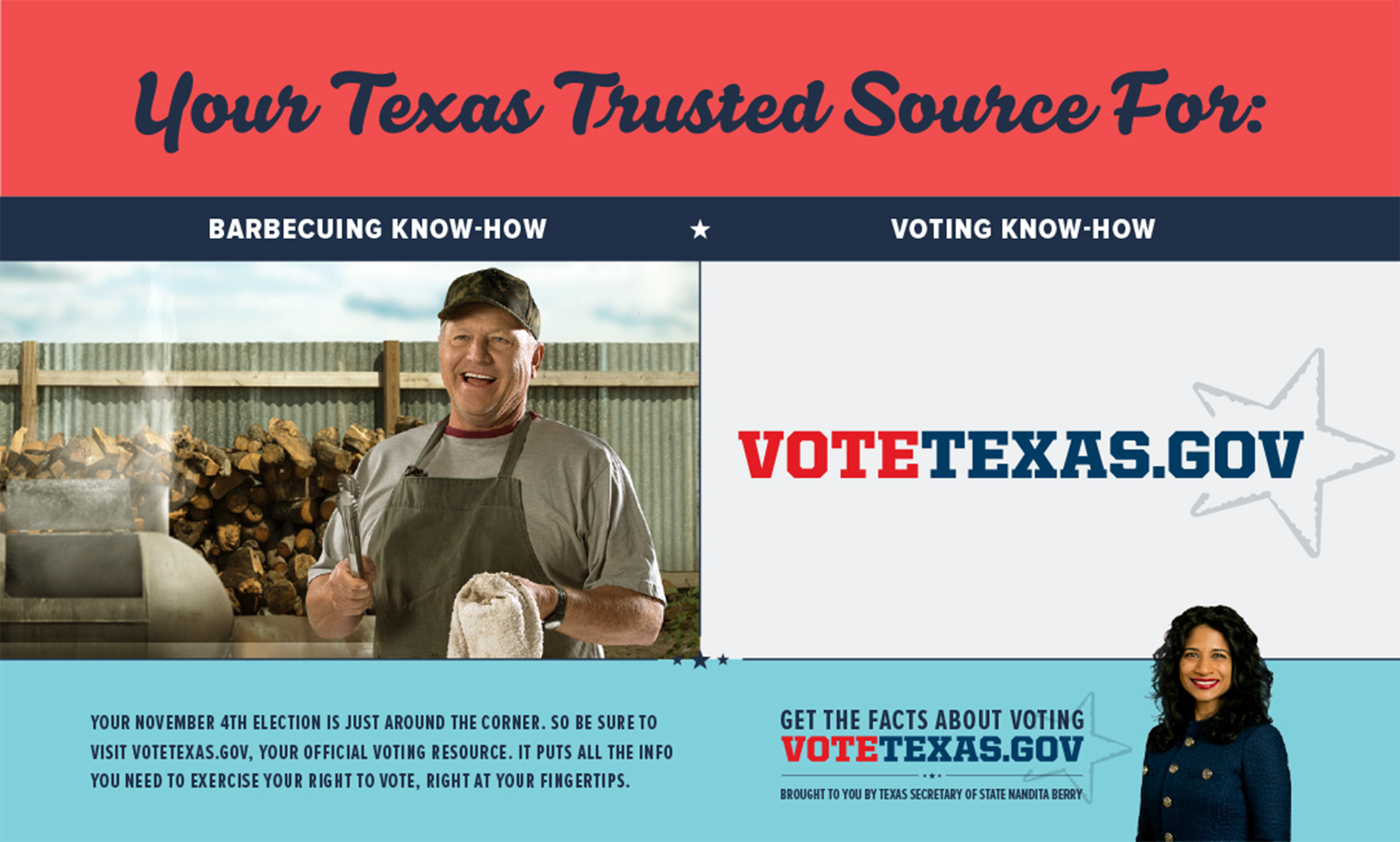 As Early Voting continues and the November 4 election approaches, Secretary Berry would like to make sure all voters are equipped with the information, tools, and expertise they need to ensure a smooth, secure and successful election. To that end, the Secretary of State’s Office has a number of Vote Texas tools in English and Spanish that include professional TV and radio commercials, ready-to-print Infographics, informational videos, Vote Texas logos, newsletters, and social media resources.