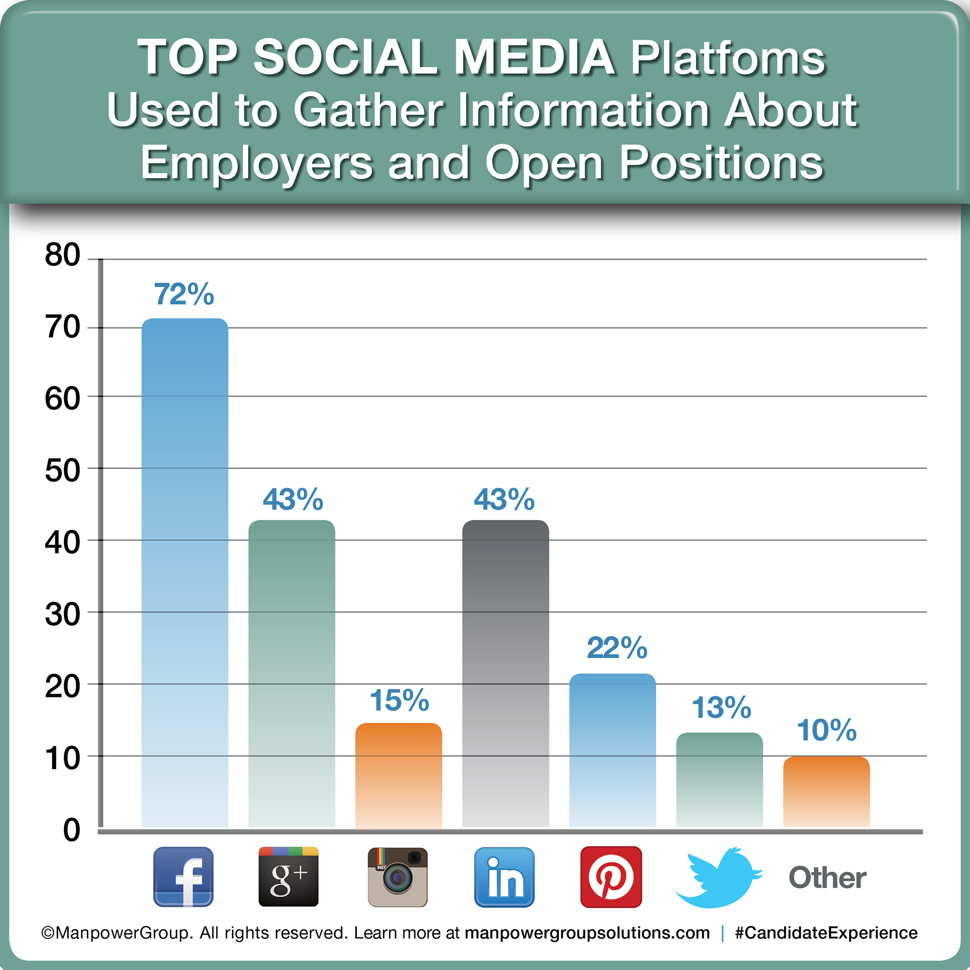- 30% use social media to get more information about open positions or employers; of these, more than 70% use Facebook, 43% each use Google+ or LinkedIn