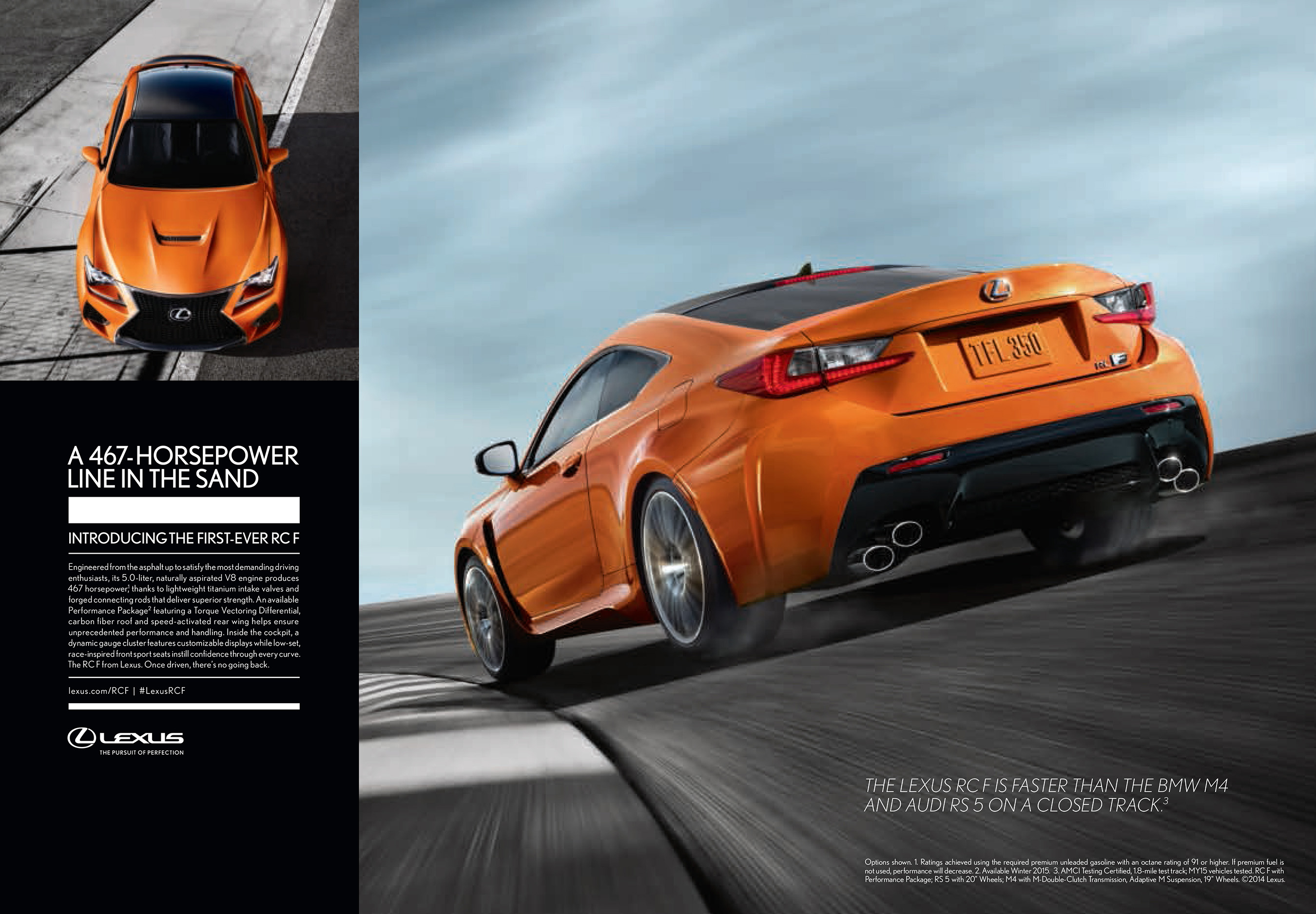 “The RC and RC F highlight Lexus’ continued progress in engineering vehicles that push boundaries in both design and performance,” said Brian Smith, Lexus vice president of marketing. “This marketing campaign visually represents the goal of breaking barriers and speaks to adventurous consumers who are looking for the next big thing.”
