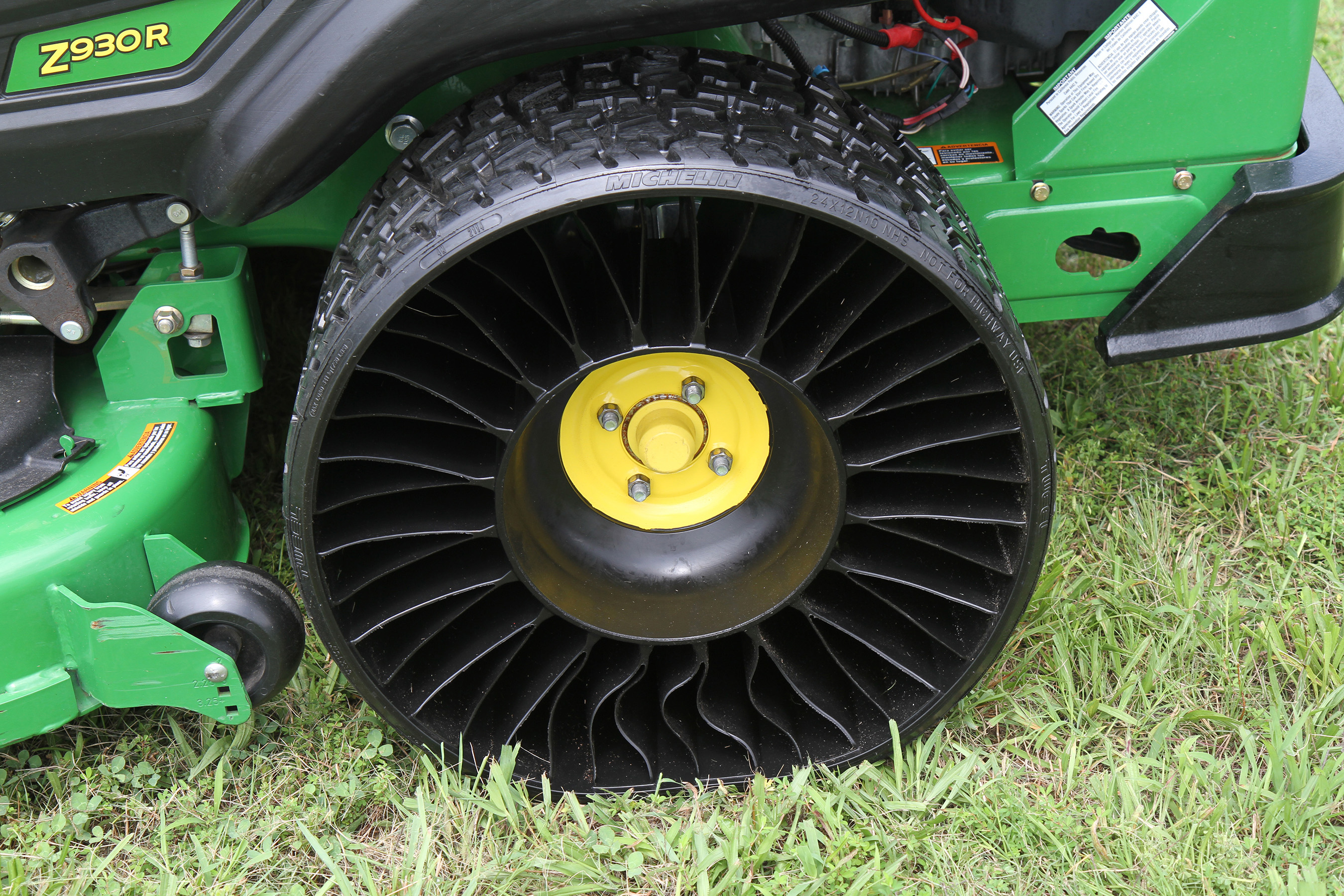 “We have been working with the John Deere team for several years and the result is a partnership that has the potential to dramatically change the commercial mowing market,” said Ralph Dimenna, head of Michelin Tweel Technologies. “Our MICHELIN X TWEEL TURF provides the benefits associated with pneumatic tires, but it won’t go flat.”