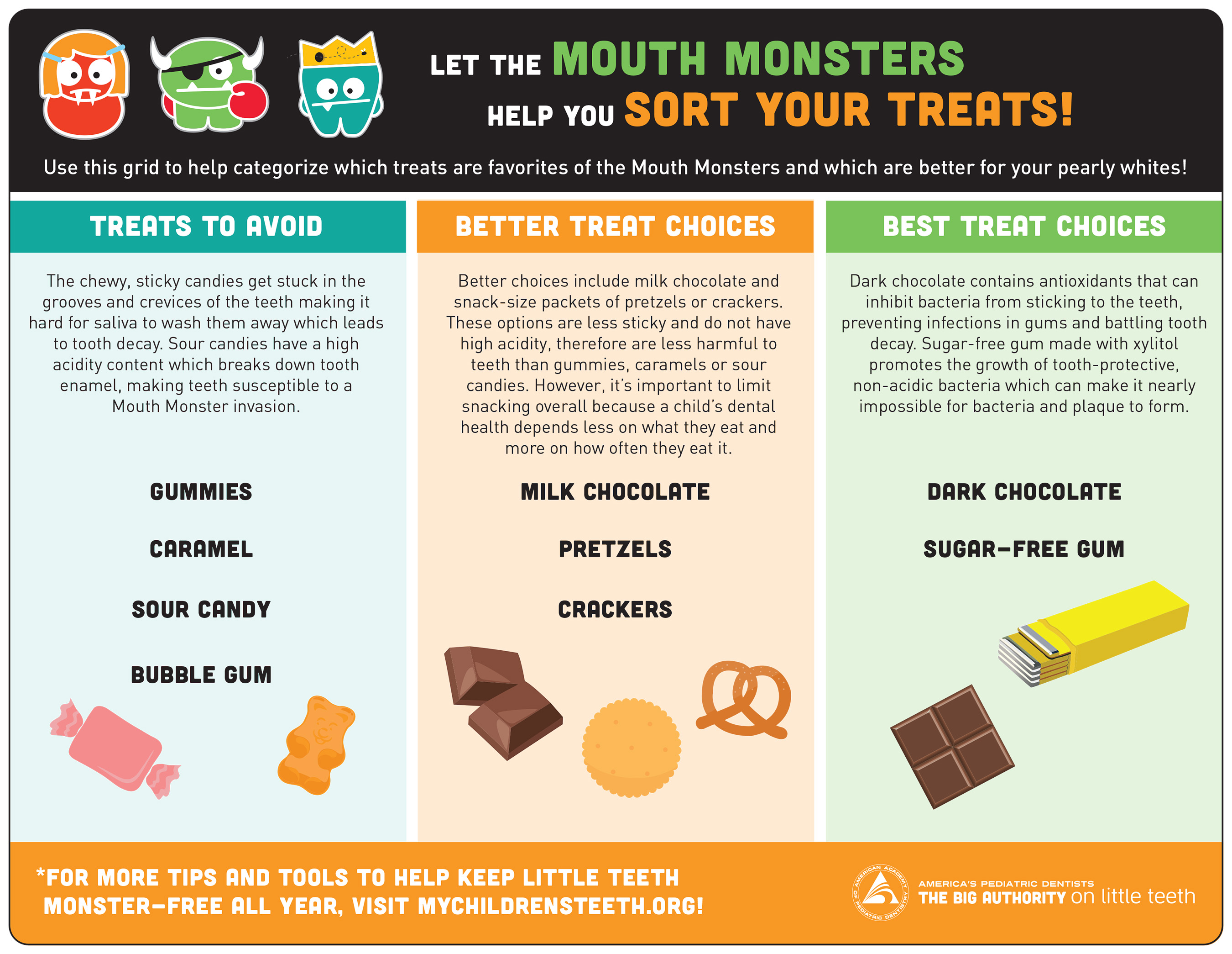 - Candy to avoid includes gummies, caramels and sour candies. The chewy, sticky candies get stuck in the grooves and crevices of the teeth making it hard for saliva to wash them away which leads to tooth decay. Sour candies have a high acidity content which breaks down tooth enamel, making teeth susceptible to a Mouth Monster invasion.