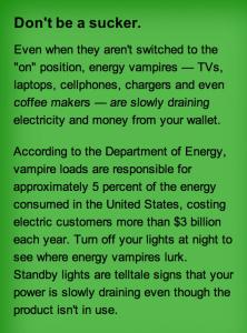 - Turn off your lights at night to see where energy vampires lurk. Standby lights on electronics, such as TVs, cable boxes, DVRs and video game consoles are telling signs that power is slowly being drained even though the product isn’t in use.