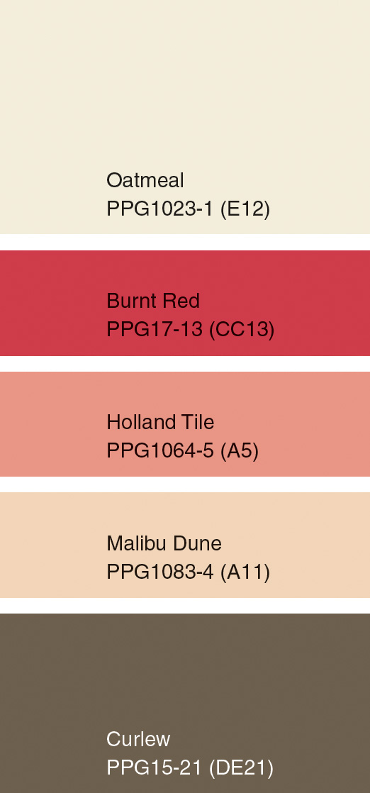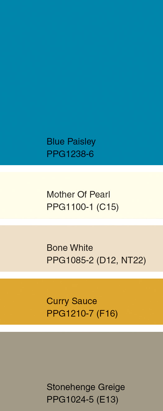 Unpretentious browns and pinks accompanied by coastal blues and yellows create a lively and natural full color palette. Some of the PPG Pittsburgh Paints colors included in this 30-shade palette are Honey Graham (PPG1069-5), Silver Dollar (PPG1022-3), Bordeaux (PPG1055-7), Bermuda (PPG1150-6) and Sheffield (PPG1139-5).