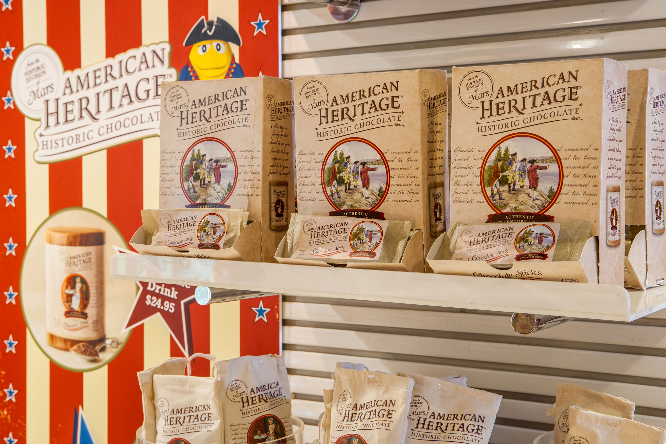 “American Heritage™ Chocolate is a perfect fit for M&M’S World®,” said Gail Broadright, Director of Mars Sponsorships, Mars Chocolate North America. “People come to M&M’S World® because they love chocolate and American Heritage™ Chocolate tells the historic journey of this beloved food. Among other interesting facts about chocolate, our guests will learn that chocolate has only been eaten as a candy or confection for a little over 100 years! For centuries, our founding fathers enjoyed chocolate as a hot beverage.”