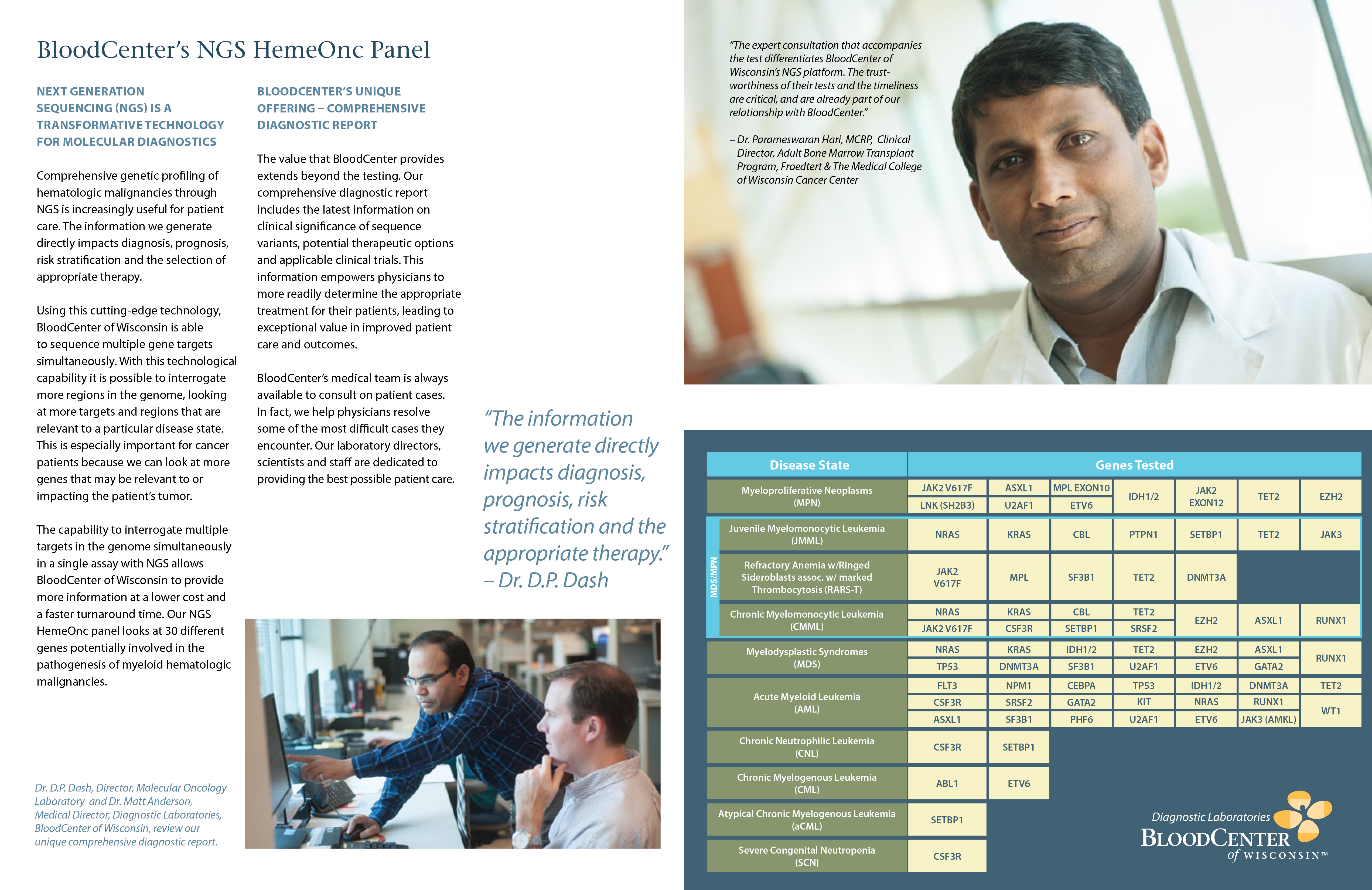 “Using NGS technology, BloodCenter can use one assay to detect the genetic changes in 30 gene targets that may be present in a patient’s tumor,“ says D.P. Dash, Ph.D., director of BloodCenter of Wisconsin’s Molecular Oncology Laboratory. “Our primary focus is on hematologic malignancies such as acute myeloid leukemia (AML), myelodysplastic syndromes (MDS) and myeloproliferative neoplasms (MPN). The panel provides oncologists and pathologists comprehensive information that can support diagnosis, prognosis and risk stratification, and may support the use of targeted therapy.”