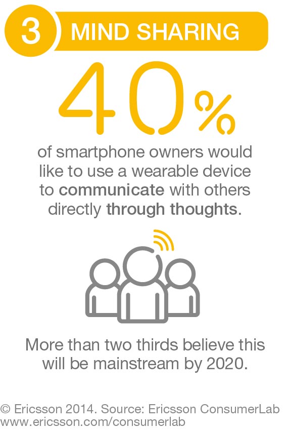 - Mind sharing. Smartphone owners would like to use a wearable device to communicate with others directly through thought – and believe this will be mainstream by 2020.