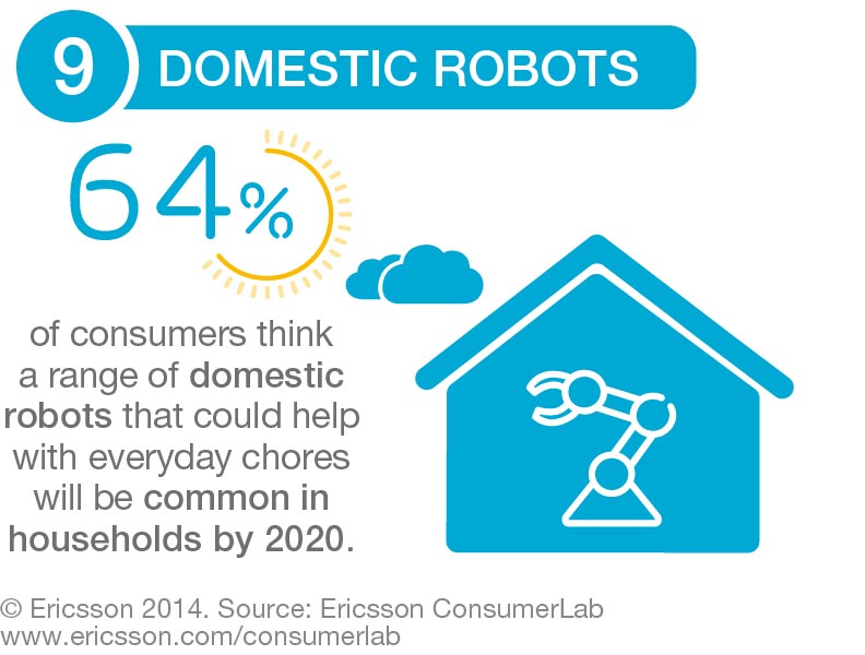 - Domestic robots. Consumers are welcoming the idea of having domestic robots that could help with everyday chores and believe this will be common in households by 2020.