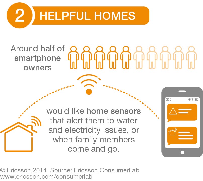 - Helpful homes. Consumers show high interest in having home sensors that alert them to water and electricity issues, or when family members come and go.