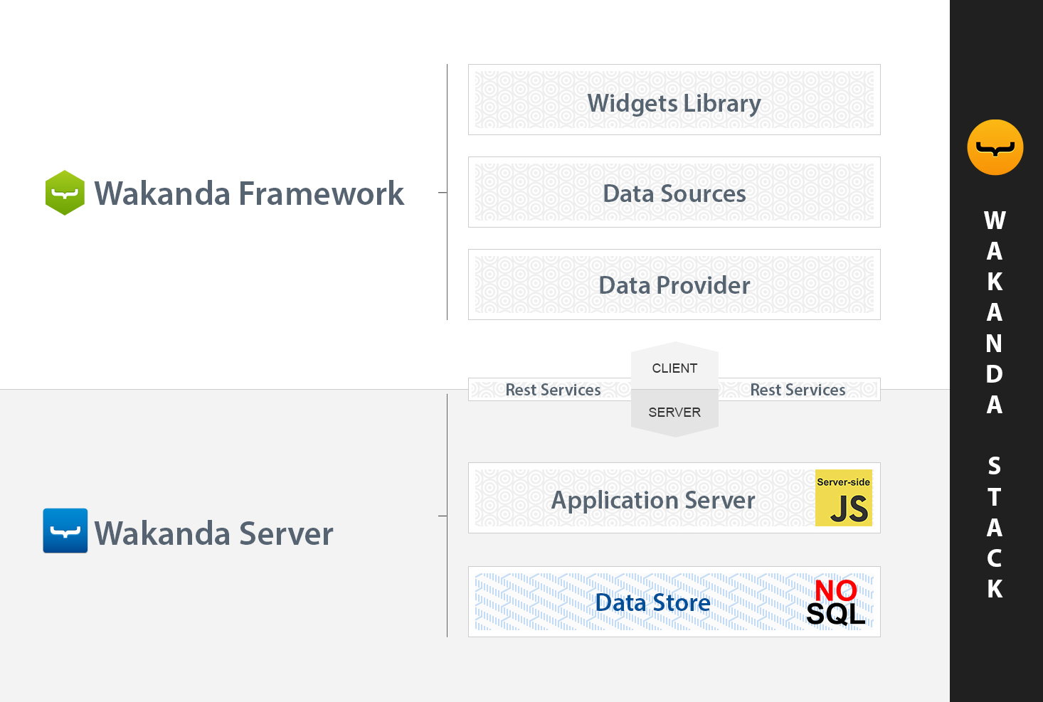 Wakanda provides developers with a data-driven JavaScript development platform for Web and mobile business applications. The Wakanda foundation relies on best-of-breed technology: A powerful and secure open-source NoSQL database & server, an extensible model-driven architecture based on JavaScript and REST, all facilitated by a complete development studio and client framework.