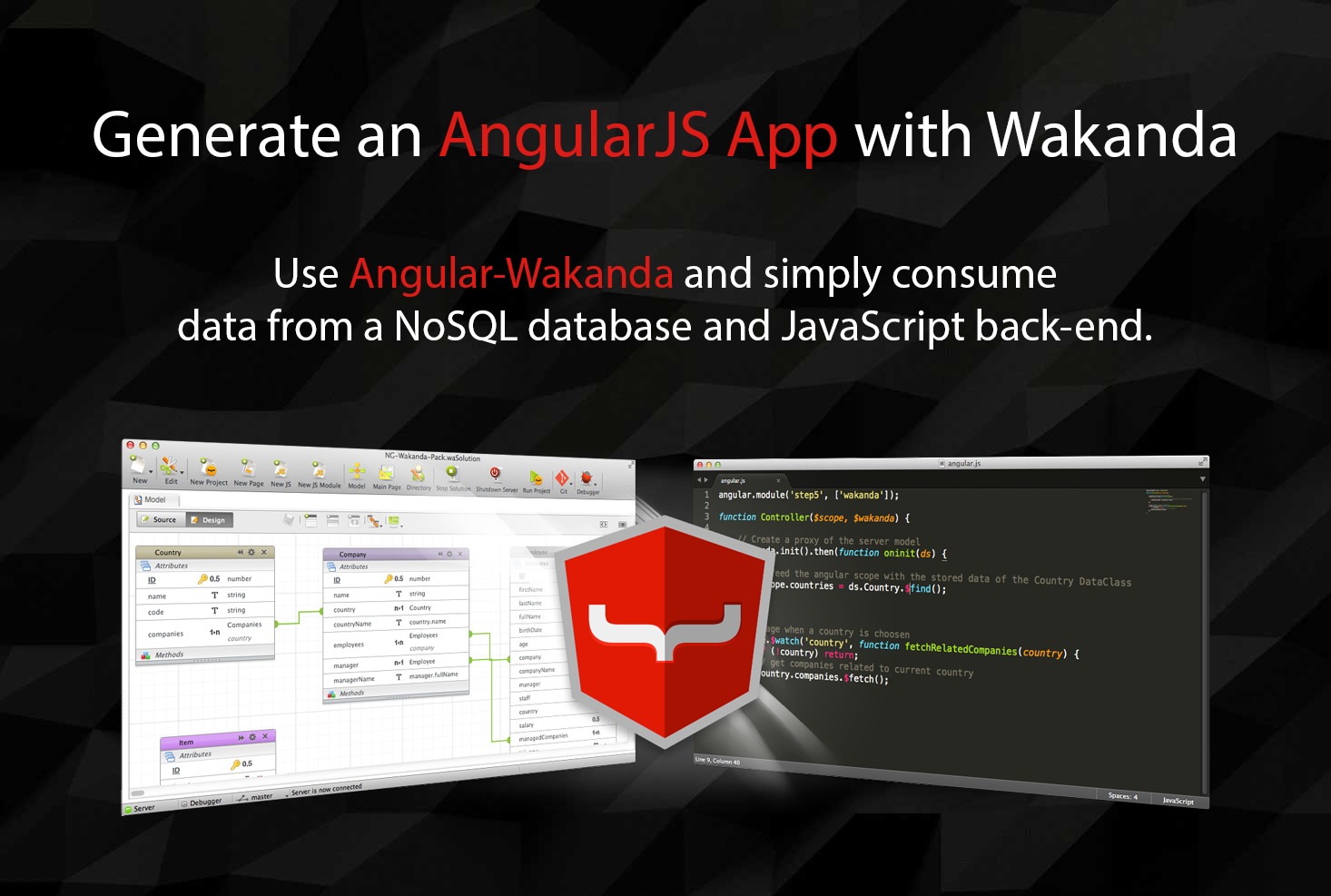 The Angular-Wakanda Connector eases client-side operation with easy navigation through object relationships, fast data paging, simple query filters, live scrolling as well as the ability to publish data from the server to the user interface.