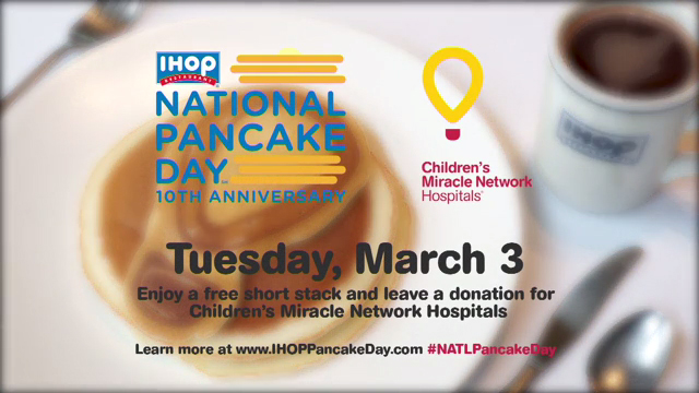 For more information on National Pancake Day or to learn more about Children’s Miracle Network Hospitals and to make a donation, please visit www.ihoppancakeday.com.