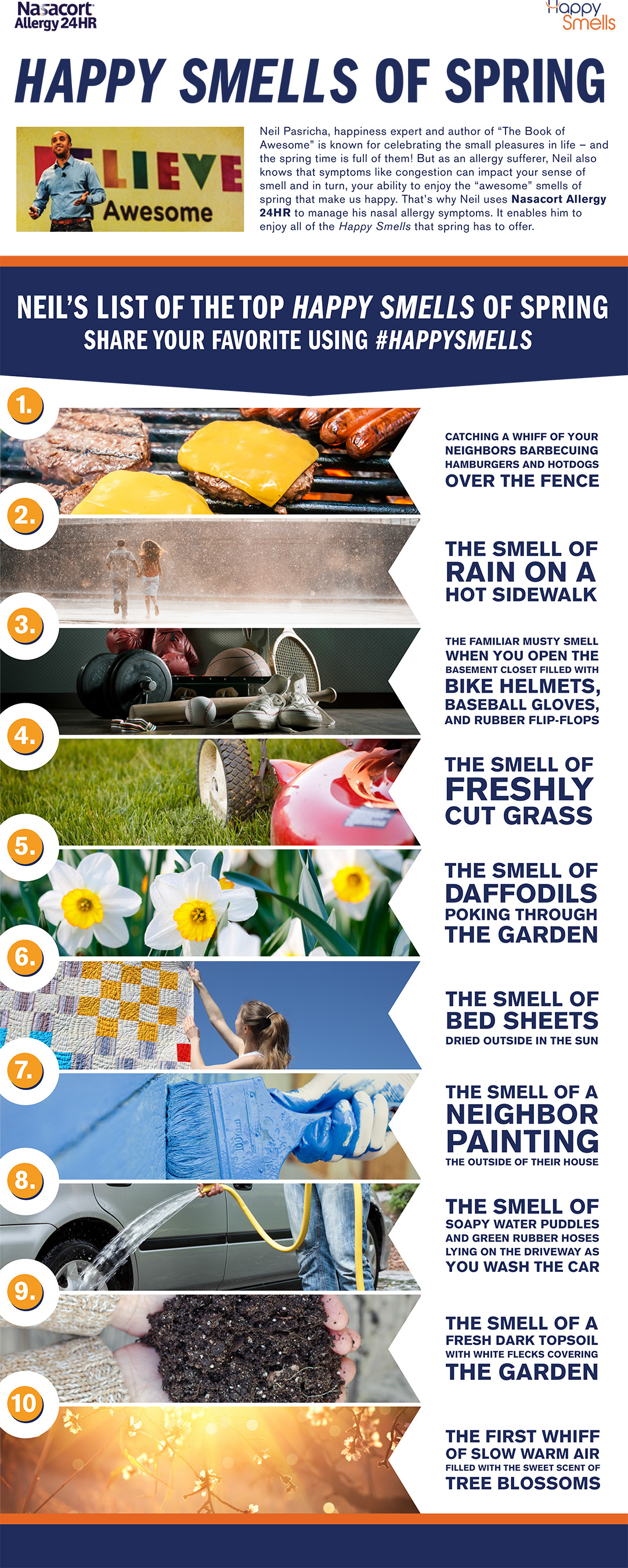 Smell is an important sense that contributes to our enjoyment of life.1 But for the more than 60 million Americans who suffer from seasonal and year-round hay fever and other upper respiratory allergies, symptoms like sneezing and nasal congestion can inhibit this sense. It’s important for nasal allergy sufferers to manage these symptoms, so they can enjoy all of the Happy Smells that spring has to offer. Together, Nasacort Allergy 24HR, Neil Pasricha and Dr. Wysocki are encouraging people to share their own favorite Happy Smells of spring using #HappySmells.