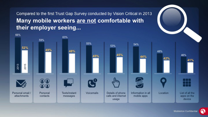Though the vast majority of these workers trust employers to keep personal information privateMobileIron on mobile devices, they are still concerned about specific types of personal data. Compared to the first Trust Gap Survey conducted in 2013 by Vision Critical, mobile workers are not comfortable with their employer seeing the following: