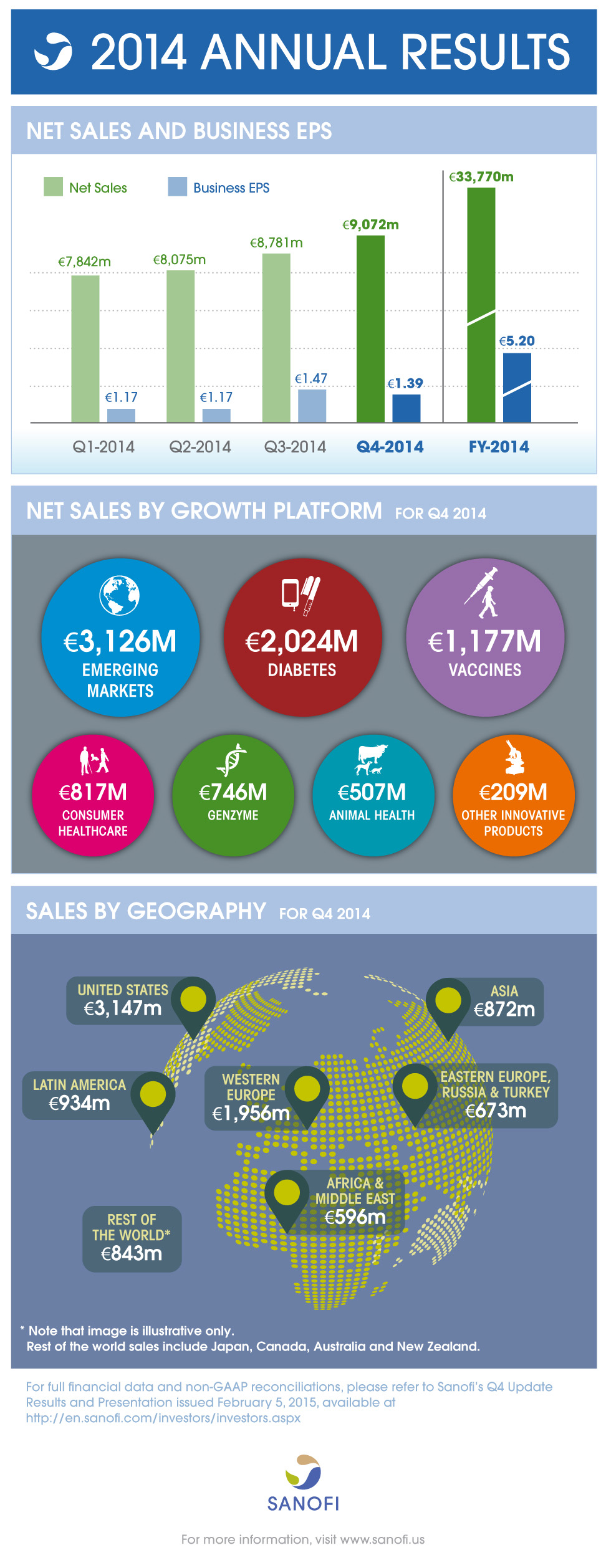 Commenting on the Group’s performance in Q4 2014, Sanofi Chairman and Chief Executive Officer, Serge Weinberg said, “We are pleased with our solid performance in 2014. The Group delivered strong financial results and we made significant progress in bringing new medicines to market. In 2015, our focus is on operational excellence as we launch multiple new medicines and vaccines. We will also invest in our R&D projects to maximize their potential. The combination of our innovative pipeline and sustainable, diversified businesses provides a strong foundation to create long-term shareholder value.”