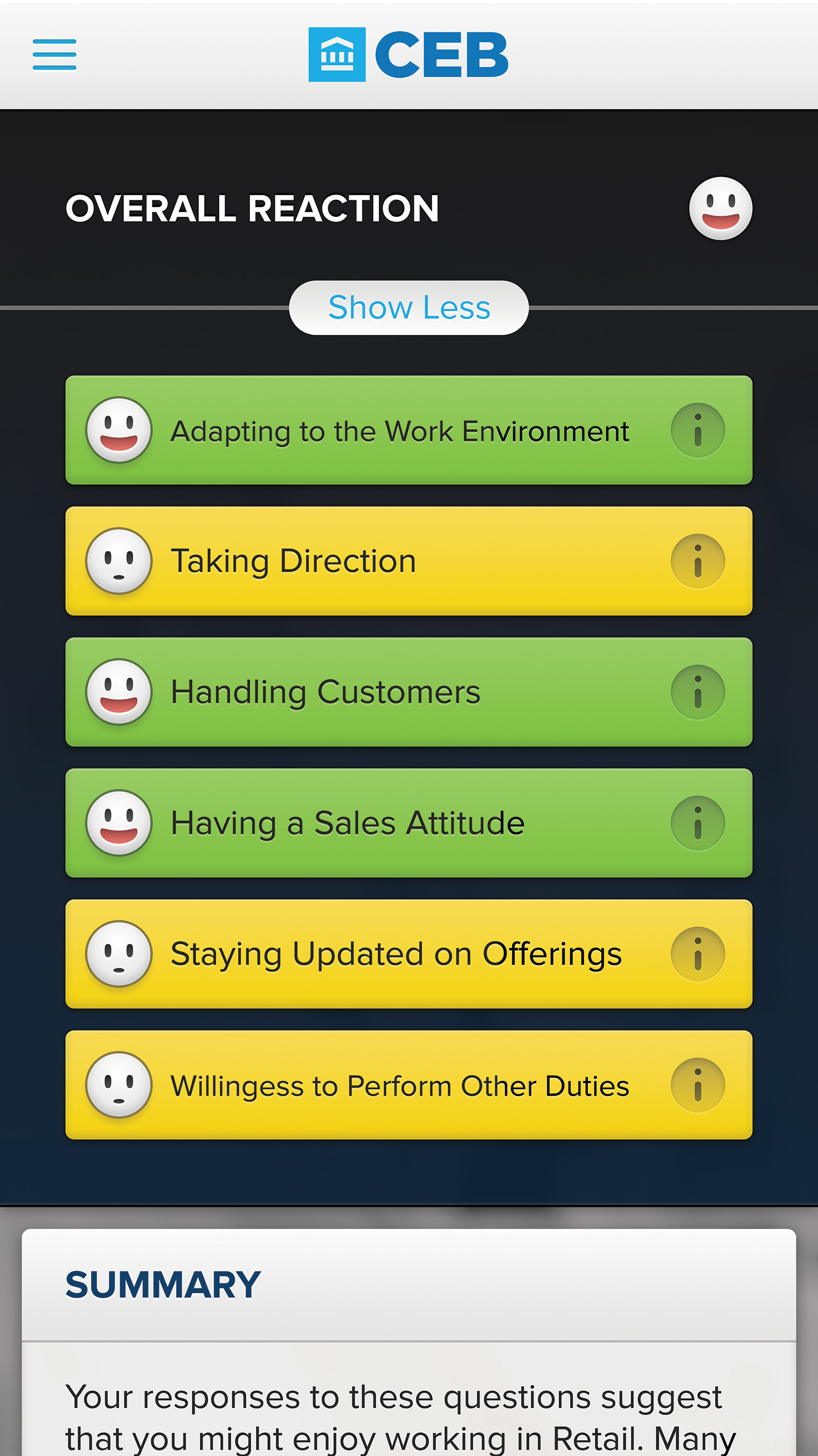 CEB Precise Fit is a better experience. By putting assessment at the front end of the hiring process and inviting candidates to determine if their interests and skills are aligned to the position, unqualified and uninterested candidates are more likely to opt-out, mitigating potential damage to the employer’s brand. Moreover, the candidates who do become employees after a positive recruiting experience exert 15 percent more discretionary effort and are 38 percent more likely to stay with the organization.