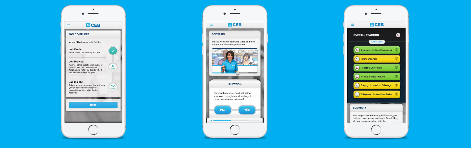 ARLINGTON, Va., Sept. 8, 2016 – CEB (NYSE: CEB), a best practice insight and technology company, today announced the launch of CEB Precise Fit. This new high-volume recruiting solution combines a candidate-friendly mobile experience with industry-leading predictive analytics to deliver more than 20 percent improvement on applicant quality. CEB Precise Fit is the only assessment solution that was built expressly for the mobile platform and that offers the candidate real-time feedback during the process, helping them determine whether the job is a good fit. This results in a more positive brand experience for the candidate and a more qualified, higher-performing applicant for the employer.
