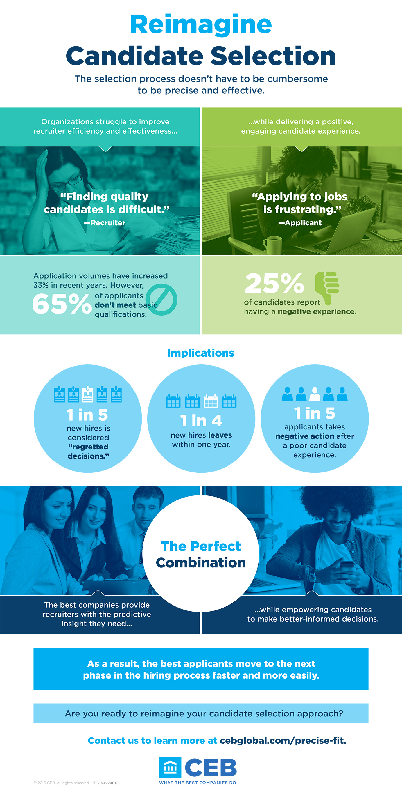 “In the war for talent, the organizations that win will be those that are able to shorten time-to-hire and improve candidate quality while simultaneously providing a great experience for applicants,” said Jeff Facteau, director of product management, CEB. “CEB Precise Fit fulfills the needs of today’s recruiter and applicant by injecting transparency and real-time feedback into what has traditionally been the ‘black hole’ of recruiting.”