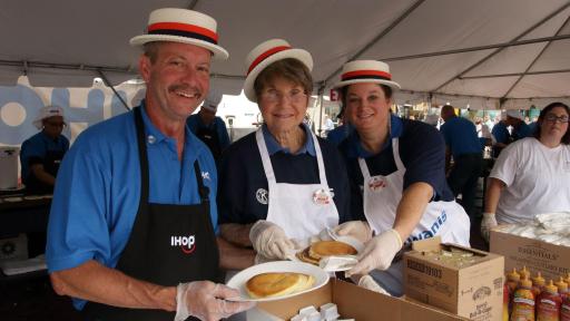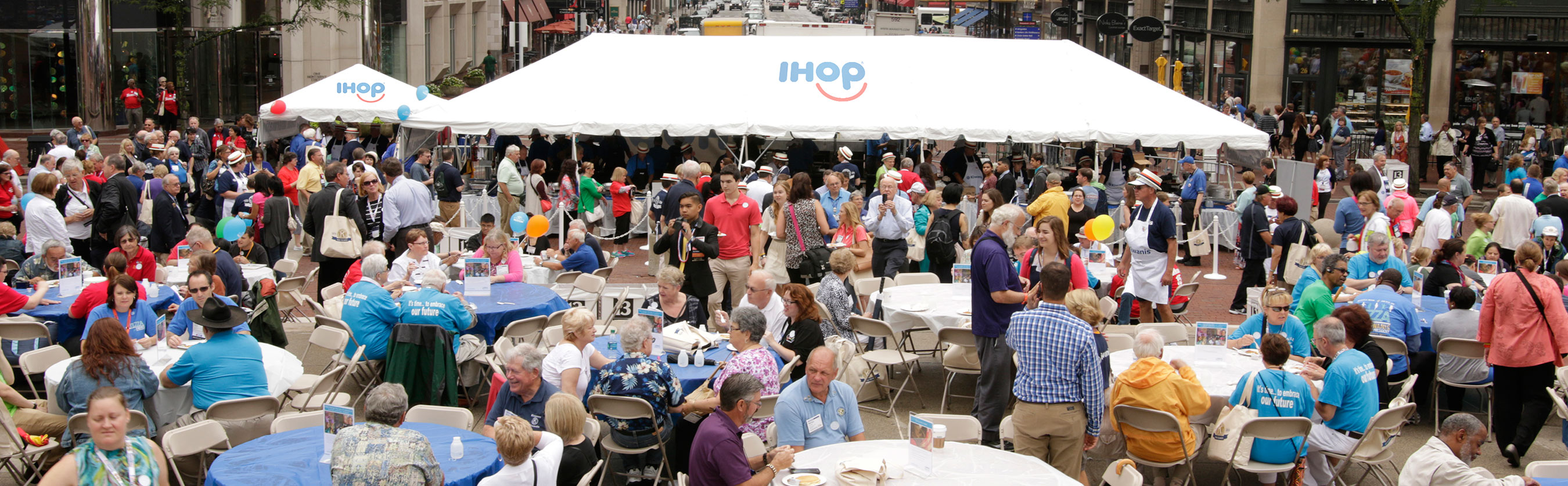 Today, more than six thousand pancake lovers from around the globe gathered in Monument Circle in Indianapolis, Indiana for a pancake fundraiser hosted by IHOP Restaurants and Kiwanis International. Thousands of Kiwanis volunteers, in town for their annual convention, and members of general public enjoyed free IHOP pancakes and coffee. Two dozen IHOP cooks prepared the pancakes made from more than 240 gallons IHOP’s famous buttermilk pancake batter, which were accompanied by 189 gallons of maple syrup, 94 pounds of butter and 625 gallons of coffee.