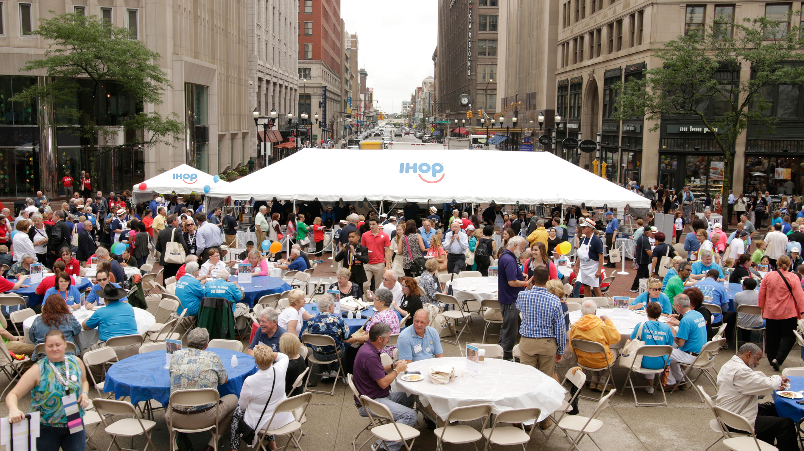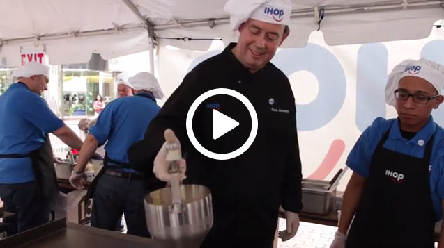 Today, more than six thousand pancake lovers from around the globe gathered in Monument Circle in Indianapolis, Indiana for a pancake fundraiser hosted by IHOP Restaurants and Kiwanis International. Thousands of Kiwanis volunteers, in town for their annual convention, and members of general public enjoyed free IHOP pancakes and coffee. Two dozen IHOP cooks prepared the pancakes made from more than 240 gallons IHOP’s famous buttermilk pancake batter, which were accompanied by 189 gallons of maple syrup, 94 pounds of butter and 625 gallons of coffee.