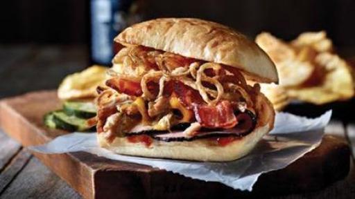 The evolution of the Applebee’s menu began with the introduction of All-In Burgers® in late 2014, and has continued with the 2015 launch of The Pub Diet™, our lineup of bar-and-grill favorites made a little better for you, 11 new appetizers and several new, over-the-top items – including the stunning Triple Hog Dare Ya™ sandwich, which is stacked high with pulled pork, Black Forest ham and thick-sliced bacon, crispy onions and melted cheddar cheese on a Ciabatta bun.