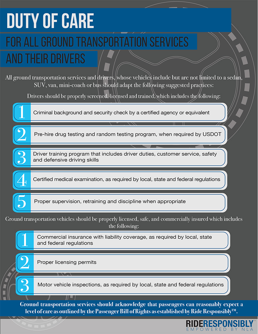 NLA, the non-profit organization responsible for and dedicated to representing the interests of the private driver transportation industry, launched Ride Responsibly™ (www.rideresponsibly.org) in early February 2015. The program is designed to help address growing public concern by providing a forum for all to voice their views on the ground transportation industry. The initiative will promote safety practices for prearranged car services and transportation network companies (TNCs), which include ride-hailing app car services, such as Lyft, Sidecar, Uber and Whisk. The Ride Responsibly™ campaign is an unprecedented effort to bridge an industry-wide gap between the rights of passengers and the responsibilities of service providers.
