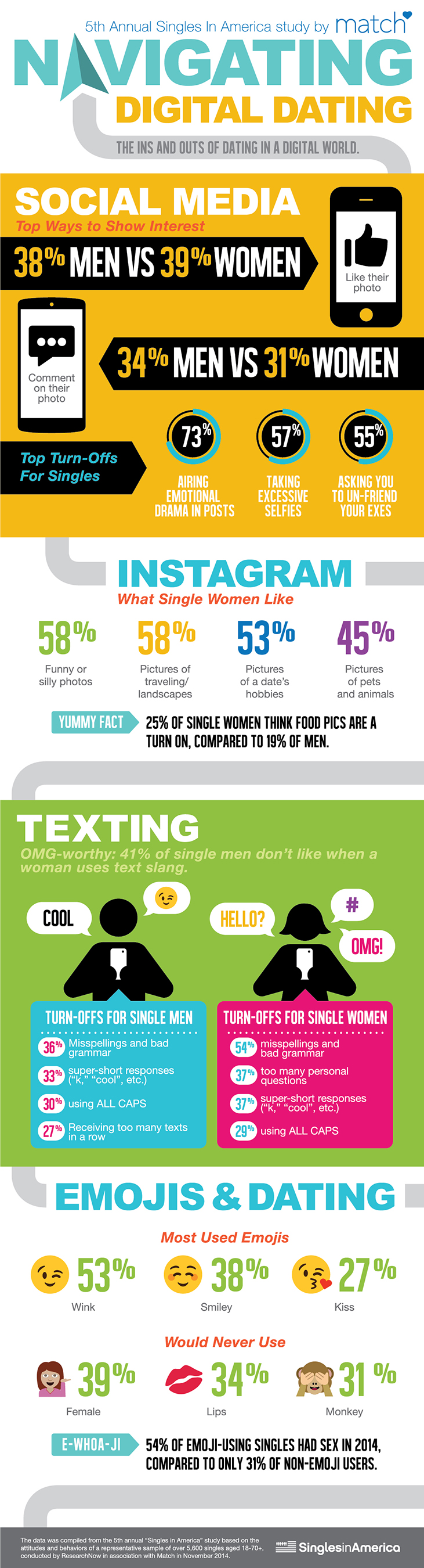 Texting turn-offs – Both single women (54%) and men (36%) find misspellings and incorrect grammar to be the biggest text message turn-offs, and 33% of single men don’t like “very short” text responses. Women don't want to receive sexts from men; men don’t want to receive texts during work; and singles don't want to receive a second text until after they have already responded to the first.