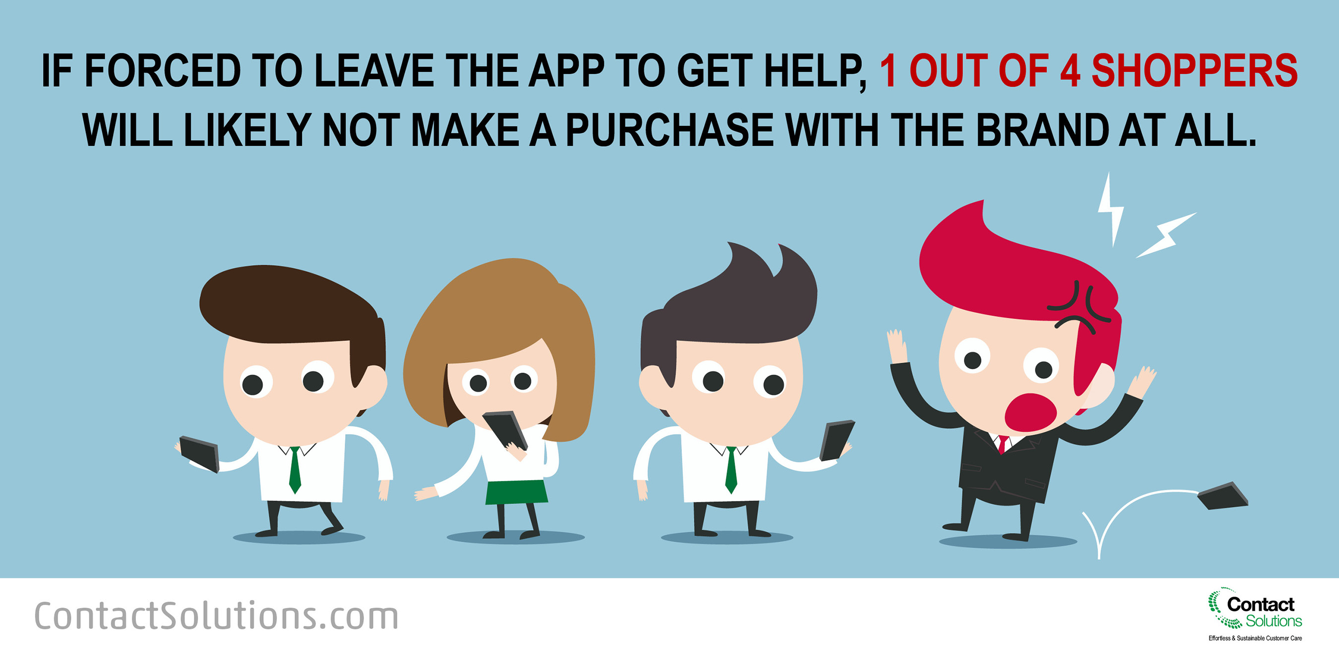 - Customer care is key to growing adoption and making mobile apps sticky: Without good care consumers grow frustrated and many will even abandon a retailer entirely, not just the retailer’s app. When shoppers need help, they expect to get it immediately and effortlessly. If forced to stop what they’re doing and leave the app to get help, 1 out of 4 shoppers will be likely to not make a purchase with the brand at all.