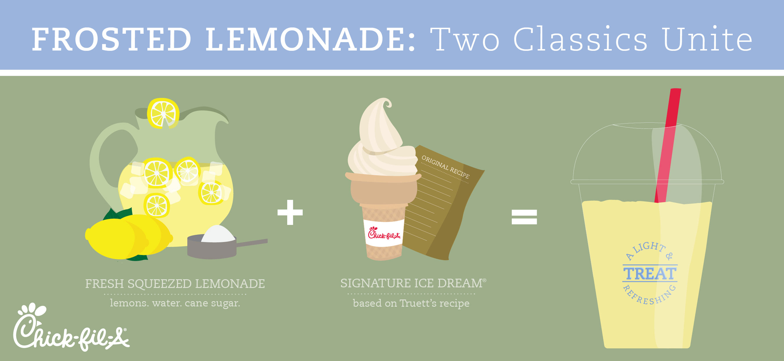 The new menu item was long rumored as a recipe created by Chick-fil-A team members to enjoy while on breaks. After hearing stories of the creative concoction, Chick-fil-A refined the Frosted Lemonade recipe and formally tested it in restaurants in Charleston, S.C., Raleigh, N.C., Sacramento, Calif., and N.W. Arkansas in spring of 2014. Positive customer feedback confirmed Chick-fil-A’s decision to launch the treat nationwide for customers seeking an on-the-go snack or an indulgence that is lighter than a milkshake.