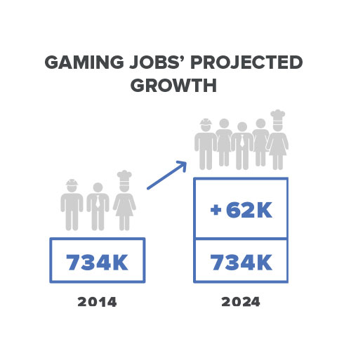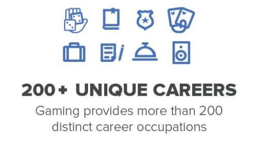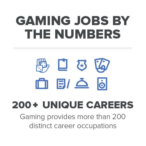 - Broad range of jobs, with tens of thousands more projected: Gaming offers a wealth of career opportunities to workers from all backgrounds with a wide variety of skill sets. Gaming employs workers in more than 200 job classifications, including high-tech, engineering, software development and law enforcement; and the industry is expected to add more than 62,000 jobs over the next decade.