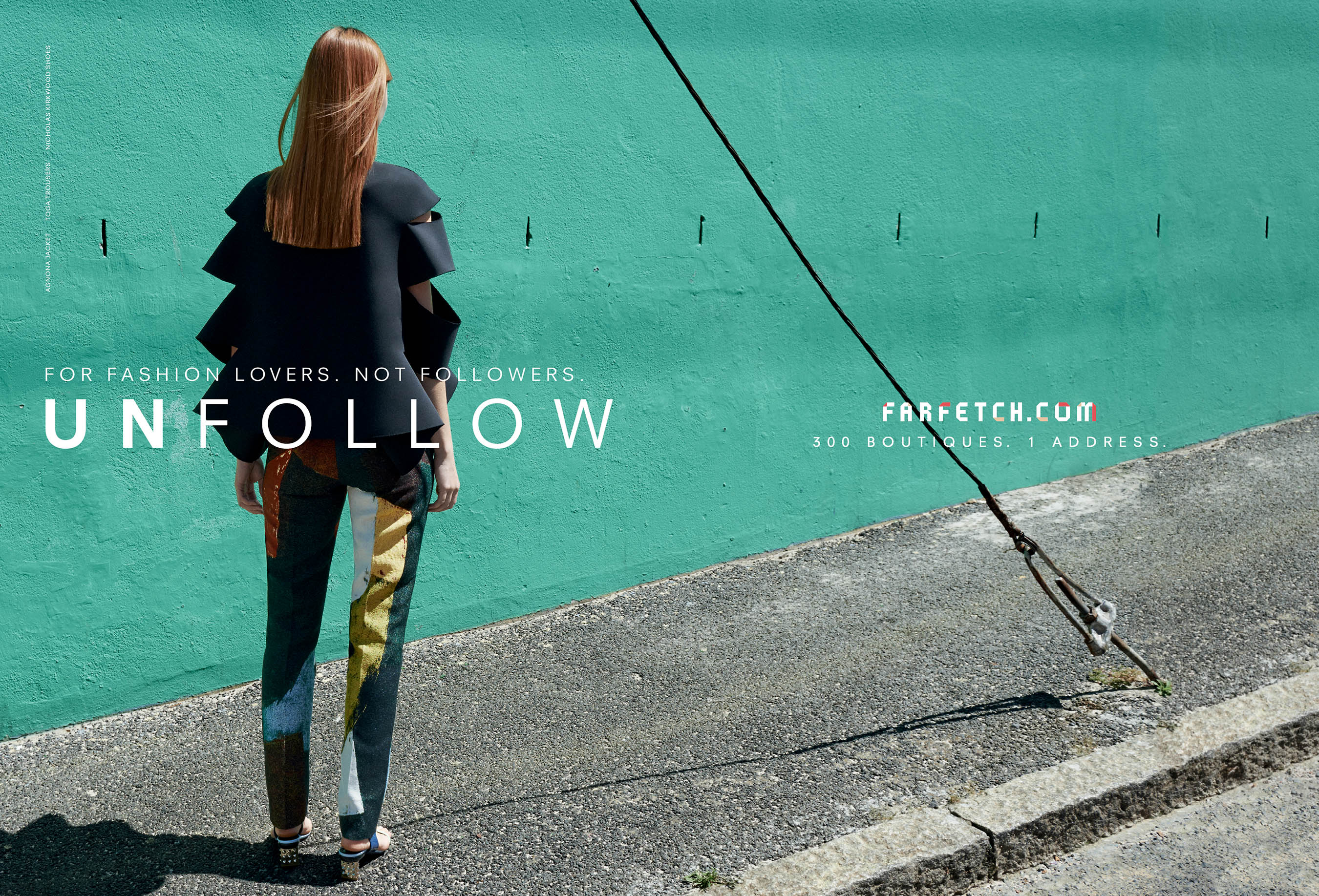 London, 09 February 2015– Farfetch, the online platform for the world's best boutiques, today announced the launch of UNFOLLOW, the company’s first print, digital and outdoor advertising campaign. Droga5 was retained to develop the campaign.