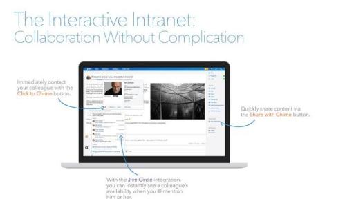 - Real-time team messaging directly from Jive-n, across devices: New “Click to Chime” and “Share with Chime” capabilities within the Jive-n profile seamlessly transfer employees to the Jive Chime desktop or mobile app for quick conversations and sharing of content.