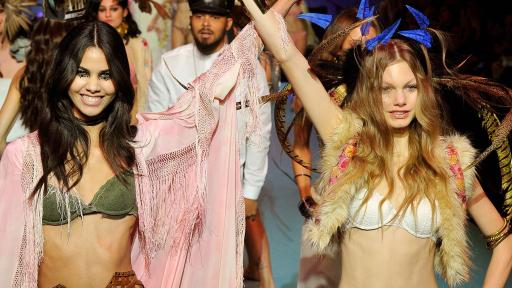 In khaki, black and pink, the Coachella scene dares a big mix: crowned with flowers or extravagant squaw-style feather headdresses, the models brilliantly combine lace, fur, fringes and prints in a flurry of multicoloured, light and airy negligees. A virtuoso nod to the festive and bohemian style of the famous Californian festival.