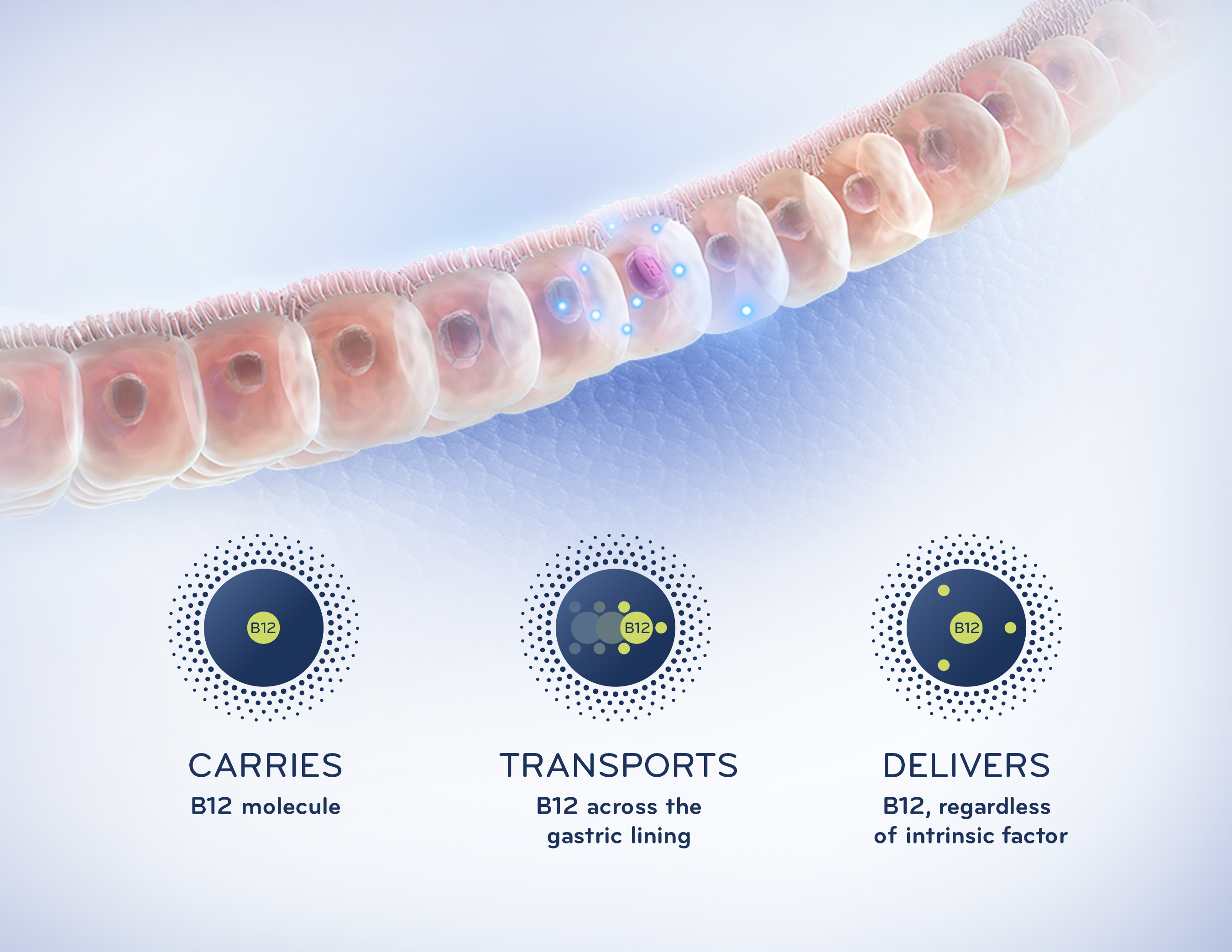 Medical B12 deficiency is a serious medical problem that, if left untreated, can cause irreversible damage to nerve cells and other co-morbidities. It can occur with a range of conditions in which there is an impaired capacity to absorb vitamin B12, including pernicious anemia, Crohn’s and celiac disease. Long term use of proton pump inhibitors (PPIs), a commonly used treatment to reduce acid in the stomach, also can impair the body’s ability to absorb B12.